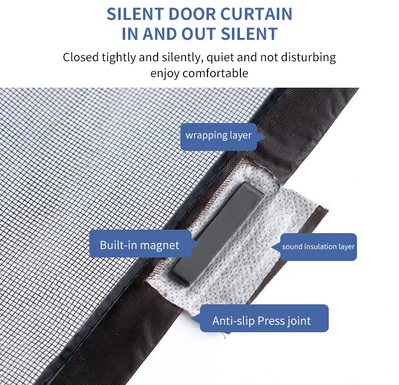 The door curtain contains multiple magnetic blocks, which can be automatically adsorbed. At the same time, non-woven fabrics are installed inside the magnetic blocks, so that the door curtain can be automatically closed without gaps, without noise, and it is convenient to enter and exit.