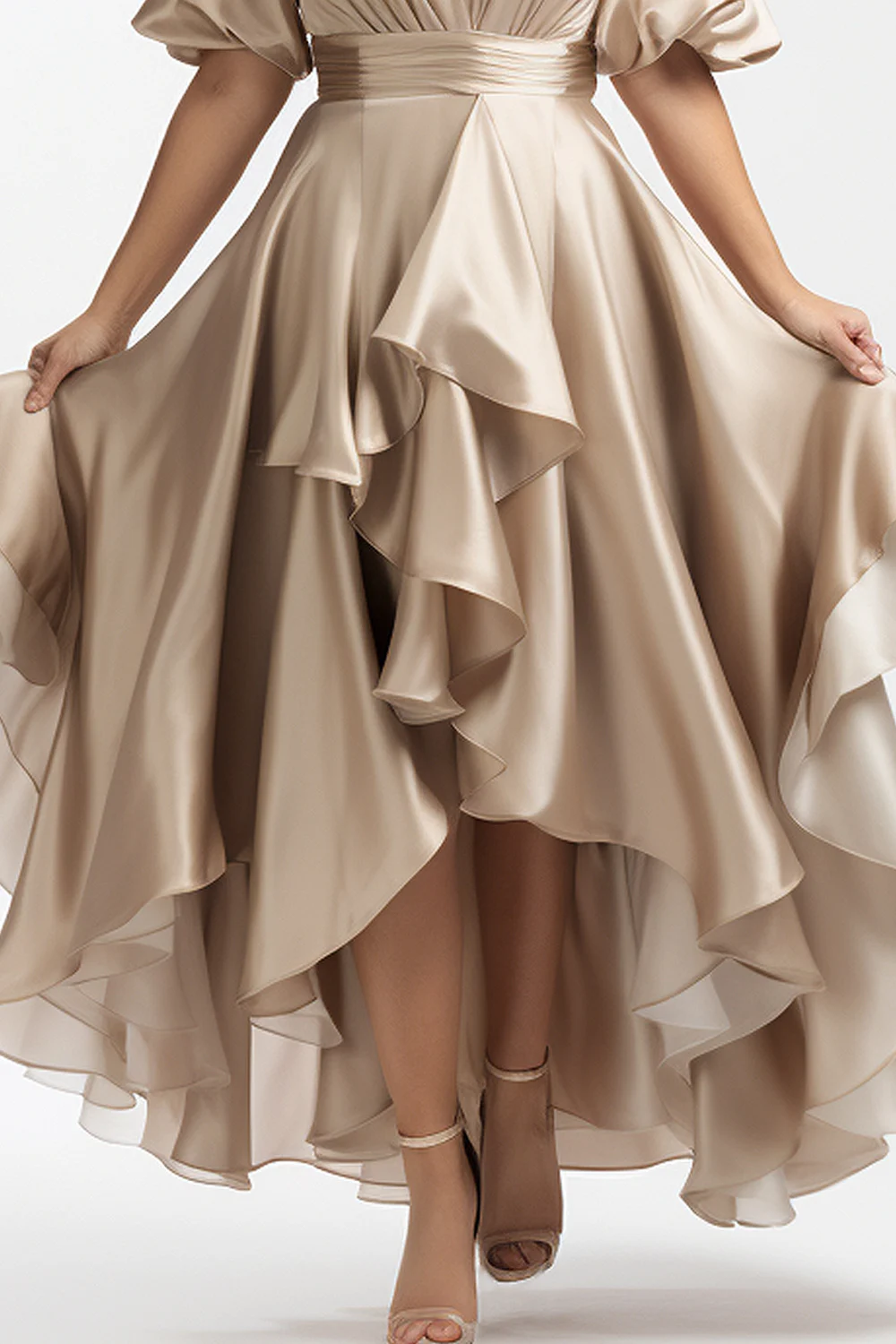 Flycurvy Plus Size Wedding Guest Champagne Satin Puff Sleeve High Low Hem Maxi Dress