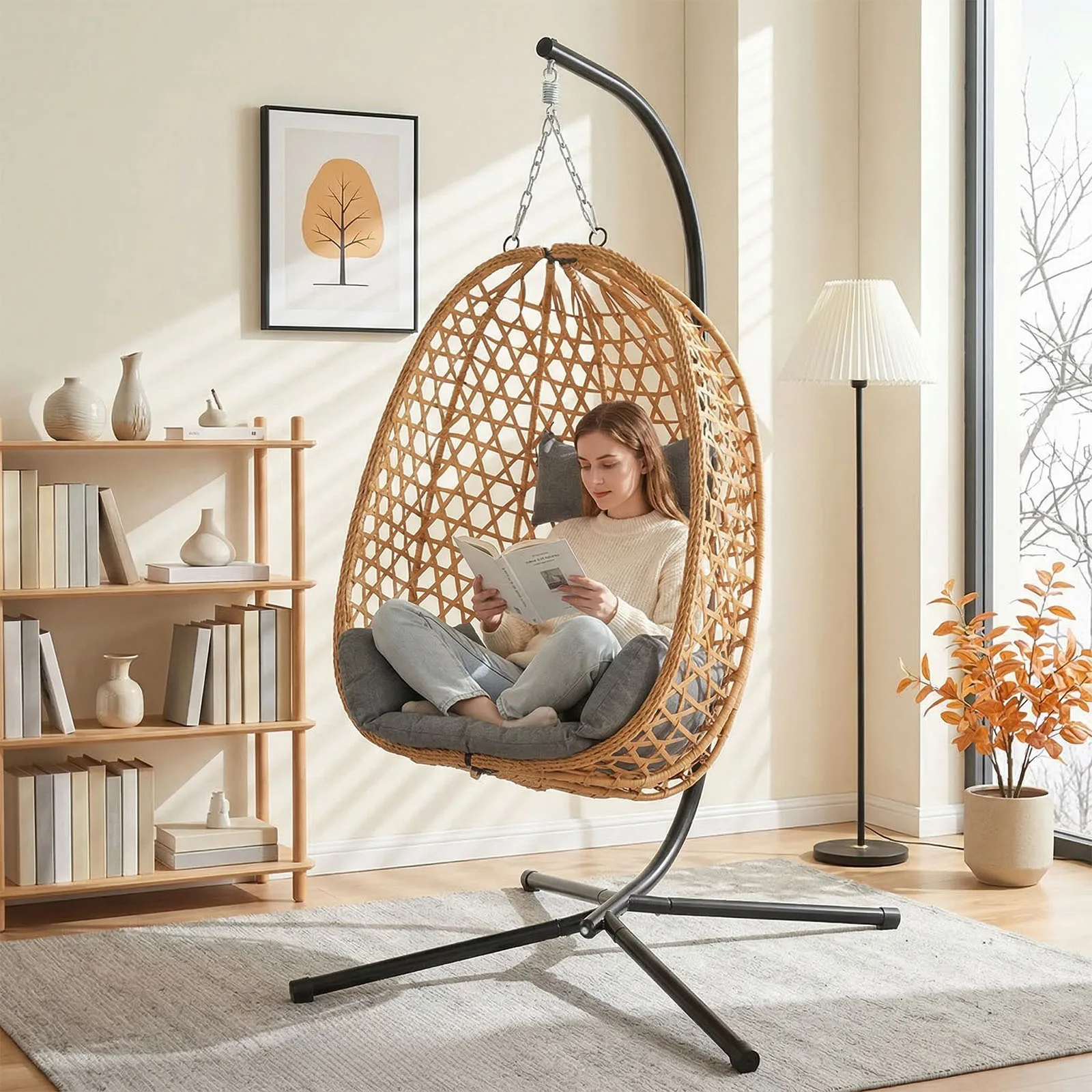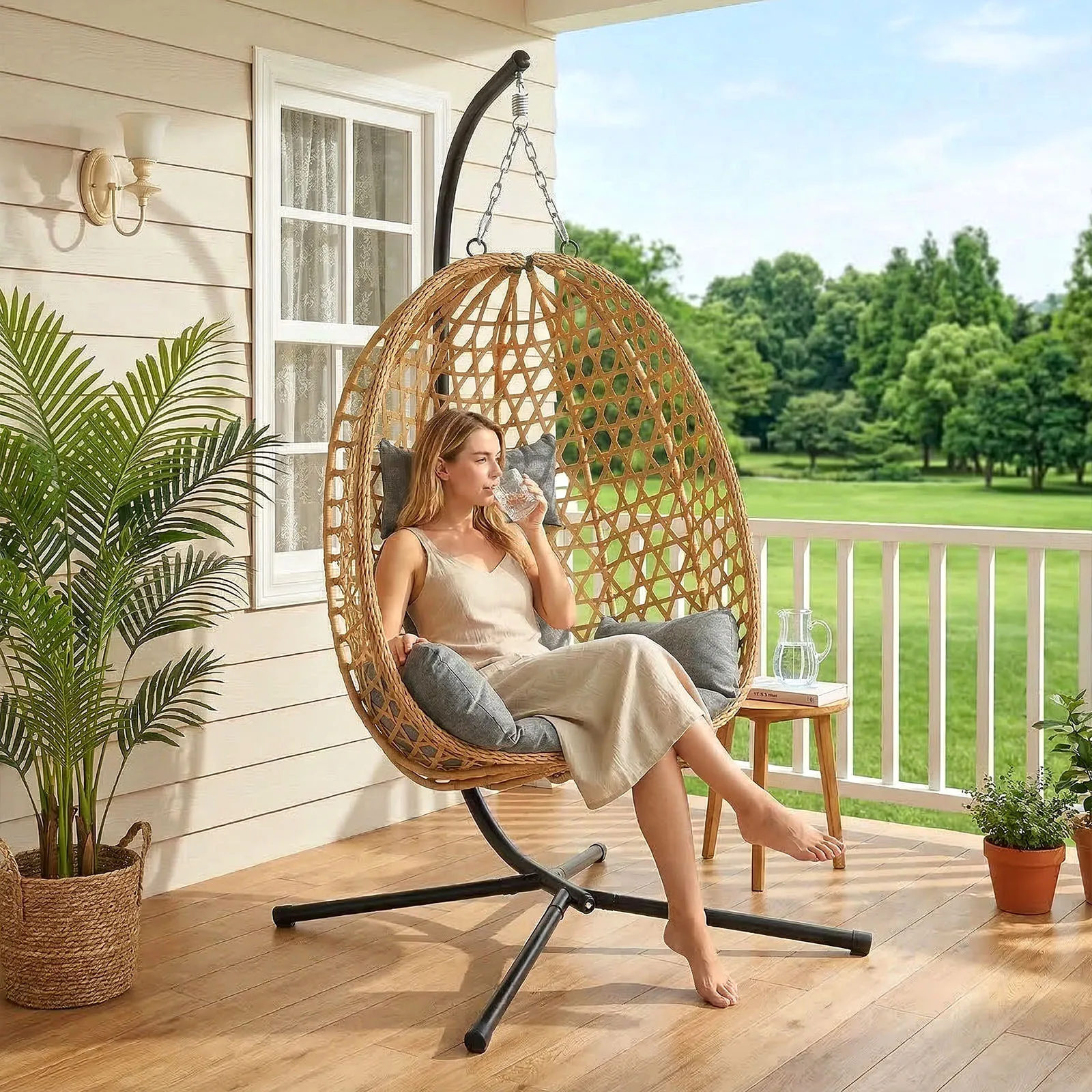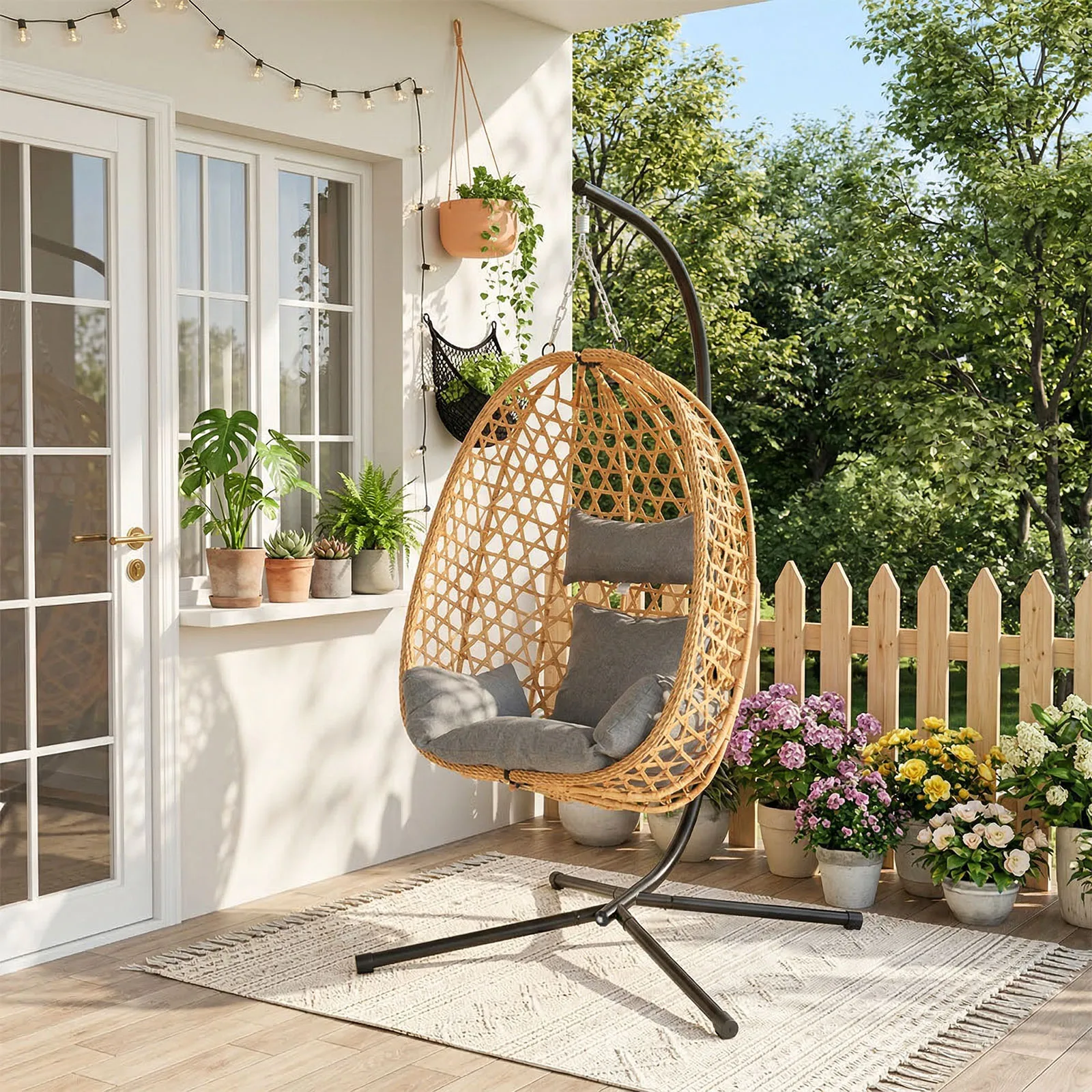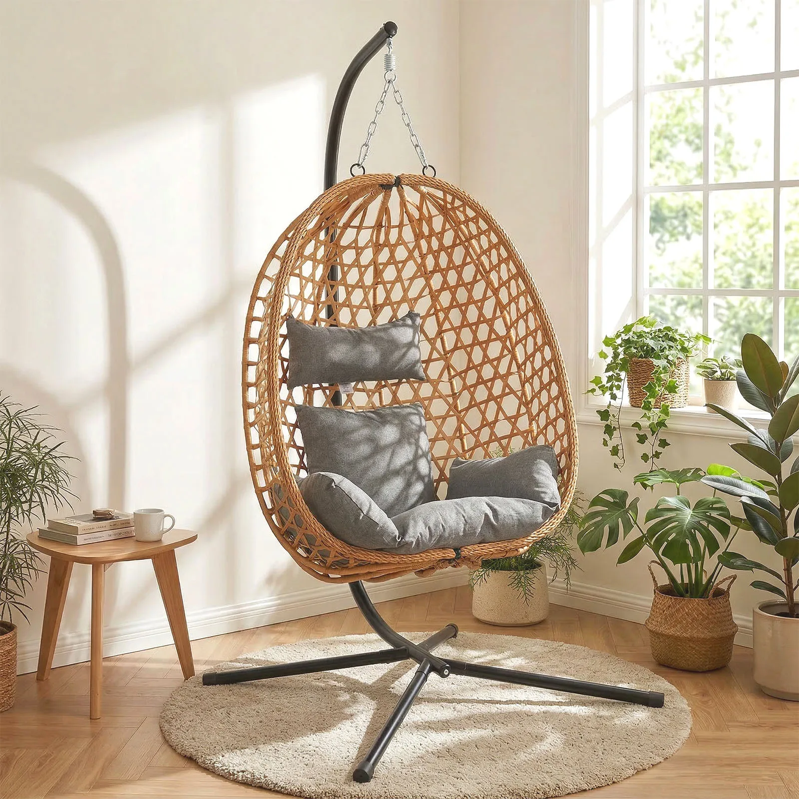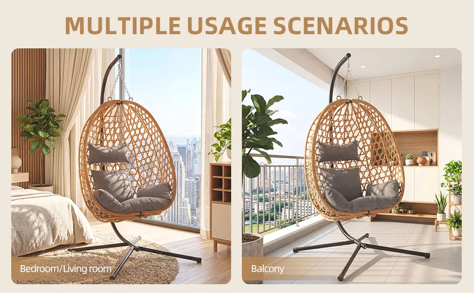 –STYLISH EGG CHAIR FOR INDOOR & OUTDOOR USE – Relax in this cosy hanging egg chair with stand—perfect for garden, patio, balcony, porch, or bedroom. Freestanding design with secure steel base.