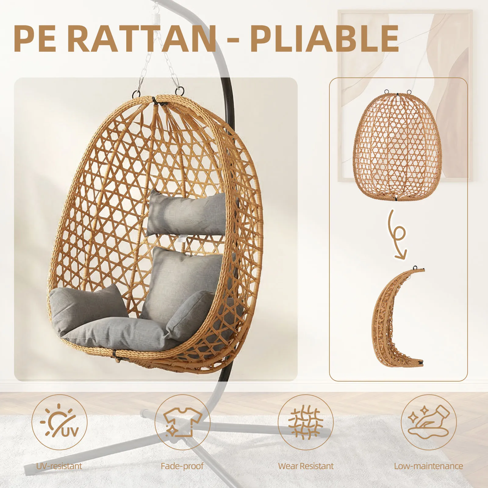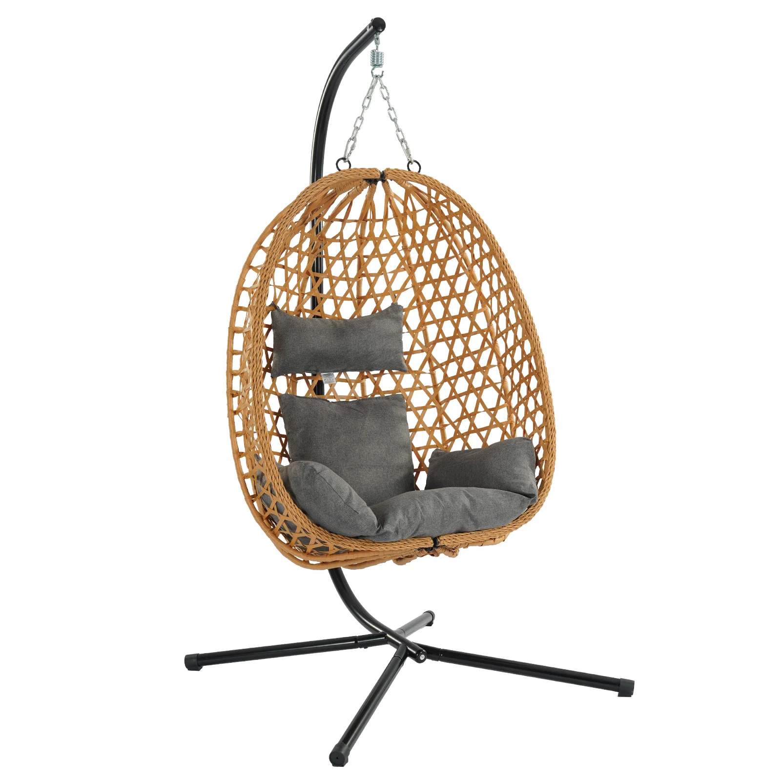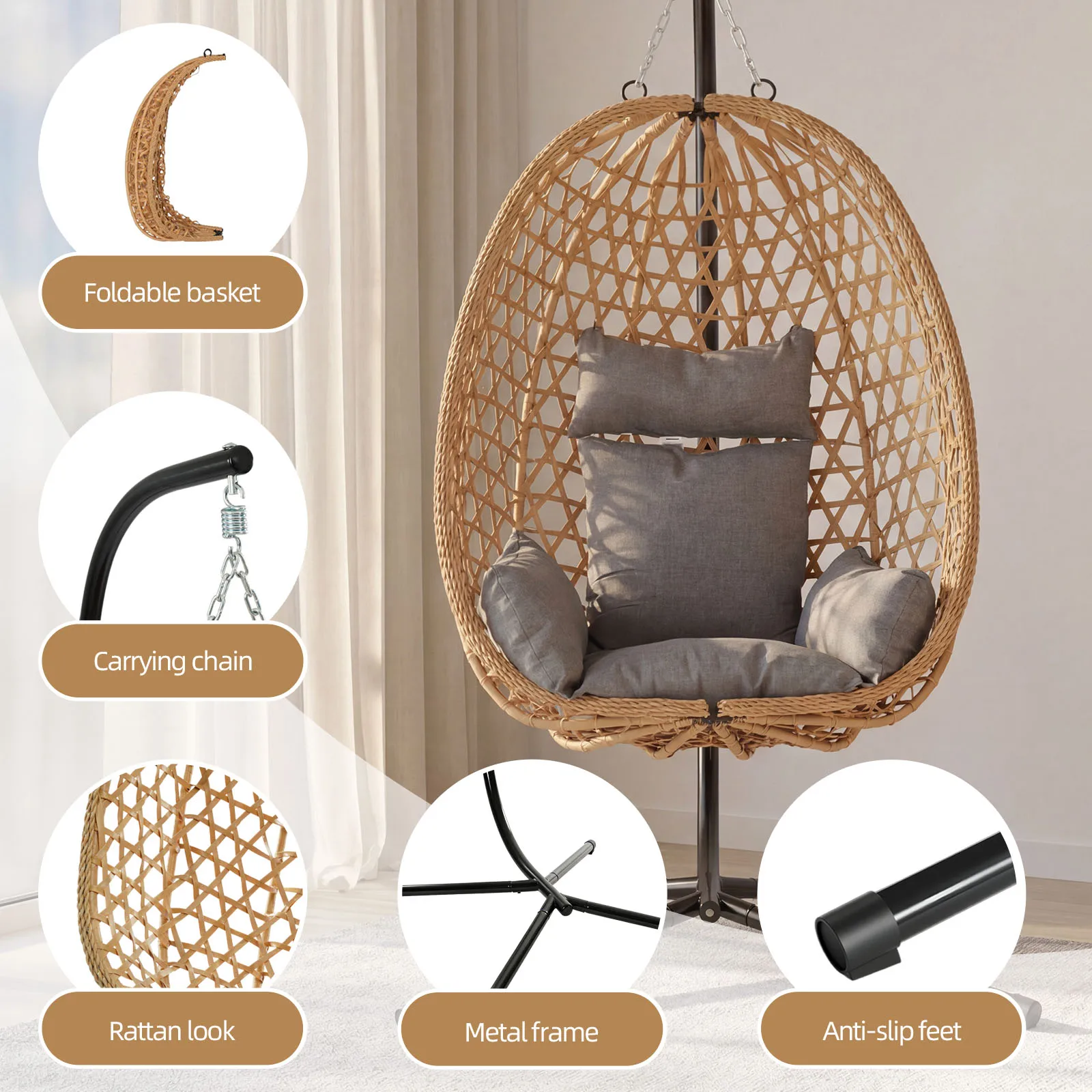 Foldable Egg Chair Rattan Wicker Hanging Swing Chair with Stand Indoor Outdoor Garden Patio Porch Bedroom Lounge Furniture