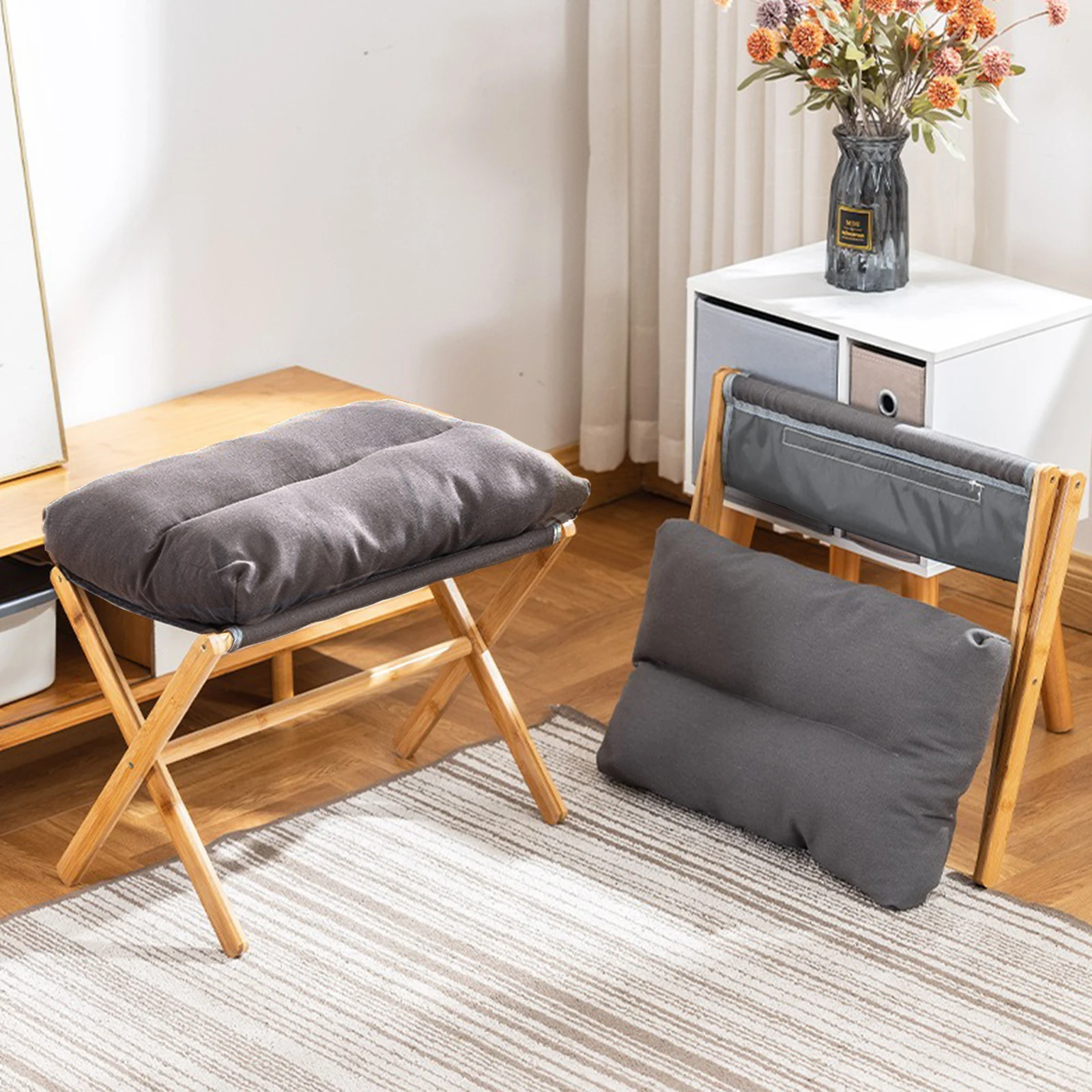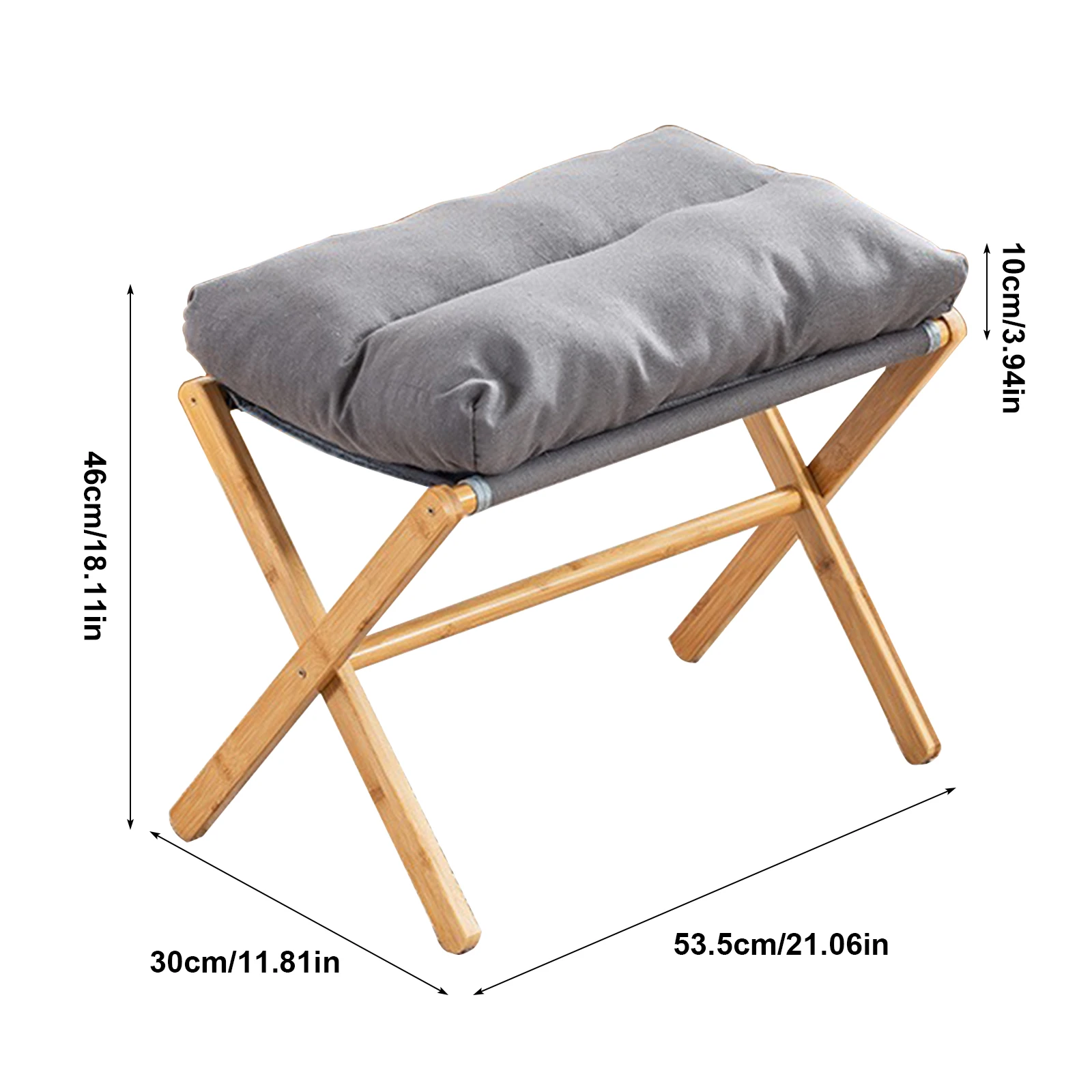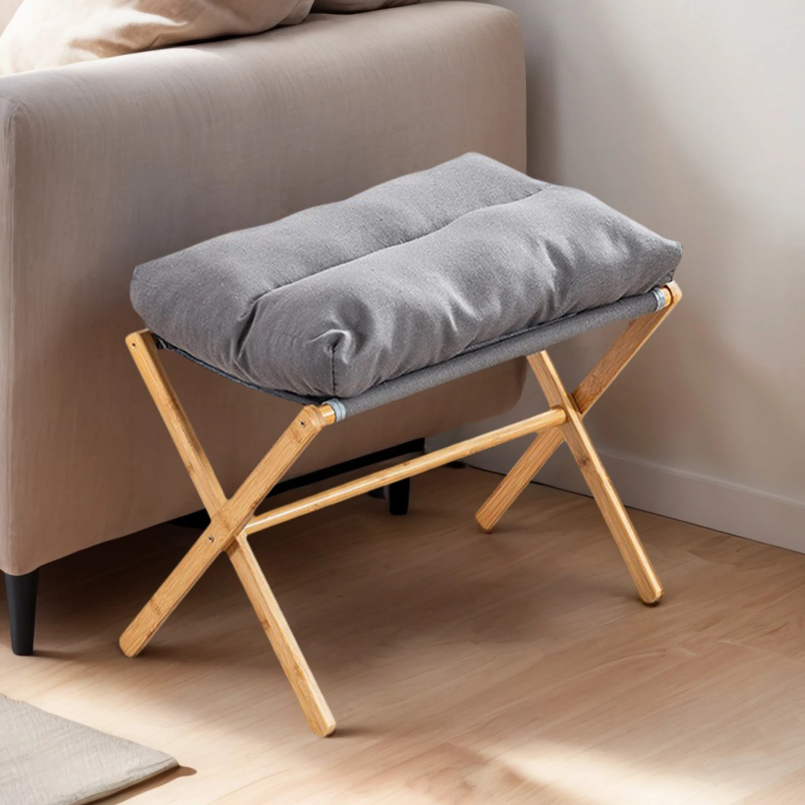 Features: 1.Foldable Sofa Stool: The foldable low stool serves efficiently as a standalone mini stool chair or as a shoe stool to enhance relaxation when used with a lazy chair or sofa. 2.Sturdy Construction: Featuring an X-shaped design with a cotton cushion, this portable footrest offers both comfort and stability. Its solid bamboo X-frame legs ensure strong support for heavy weights. 3.Dimensions & Capacity Shoe Stool: Measuring 21 inches long by 11.8 inches wide and 18.11 inches high, this foldable sofa stool tucks easily under desks or vanities. With a maximum capacity of 300 lbs, it doubles as an additional side chair in various rooms. 4.Portable Design: The foldable sofa stool is lightweight and opens quickly for easy storage. Its compact foldable design makes it for outdoor events or breaks, ensuring you can rest anywhere. 5.Easy Assembly: Accompanied by all necessary accessories and instructions, this foldable low stool can be assembled in 10-15 minutes. For any questions, contact us for a response within 24 hours.
