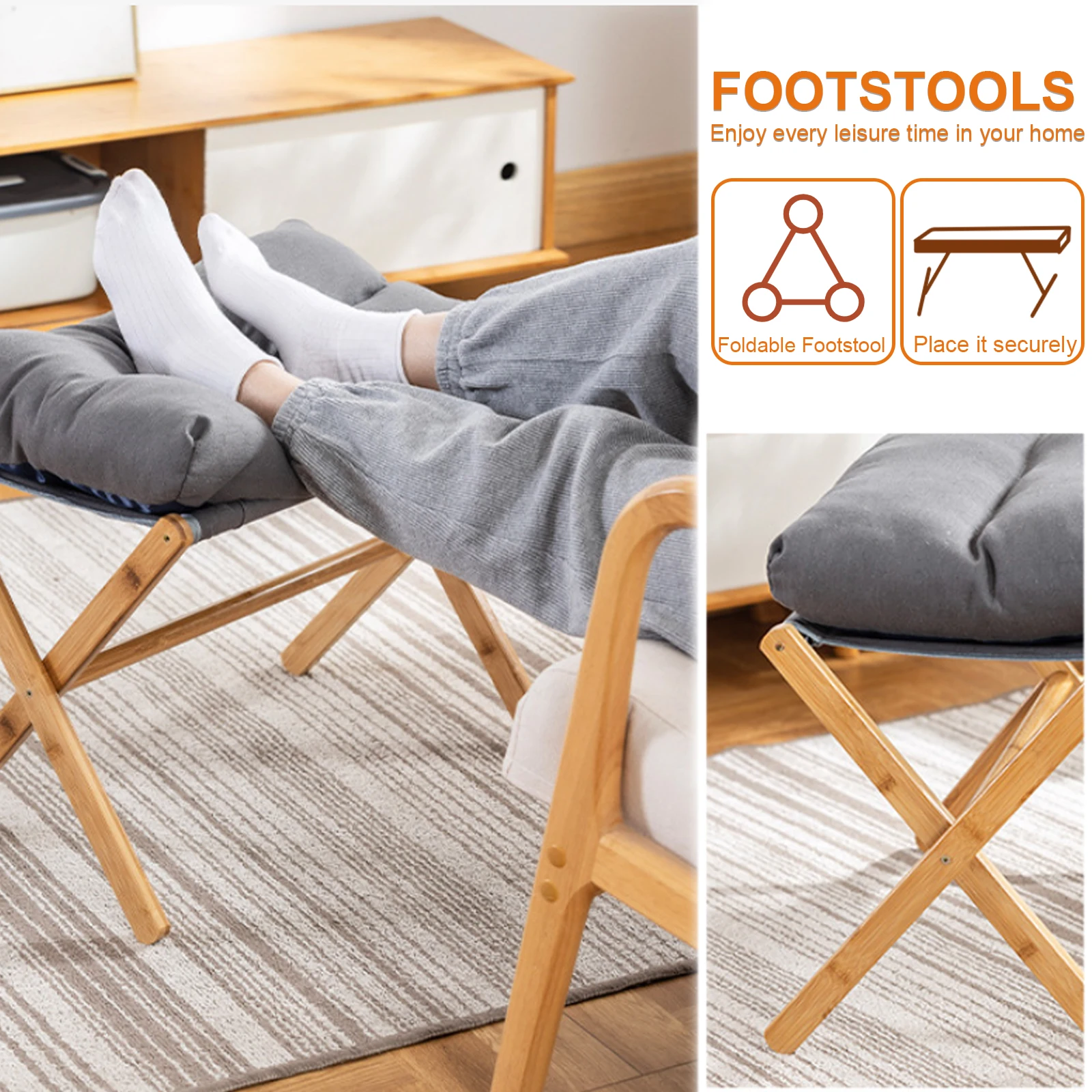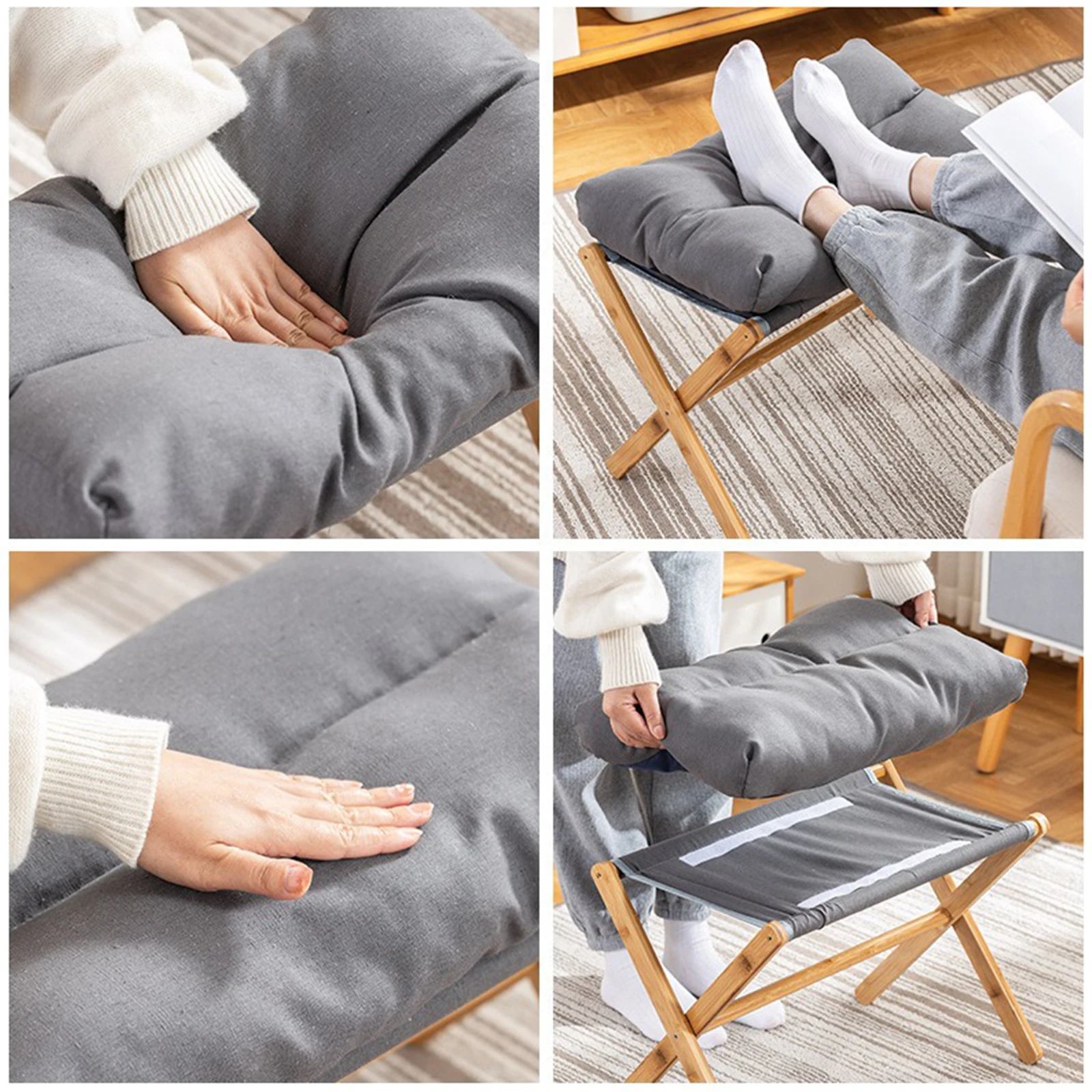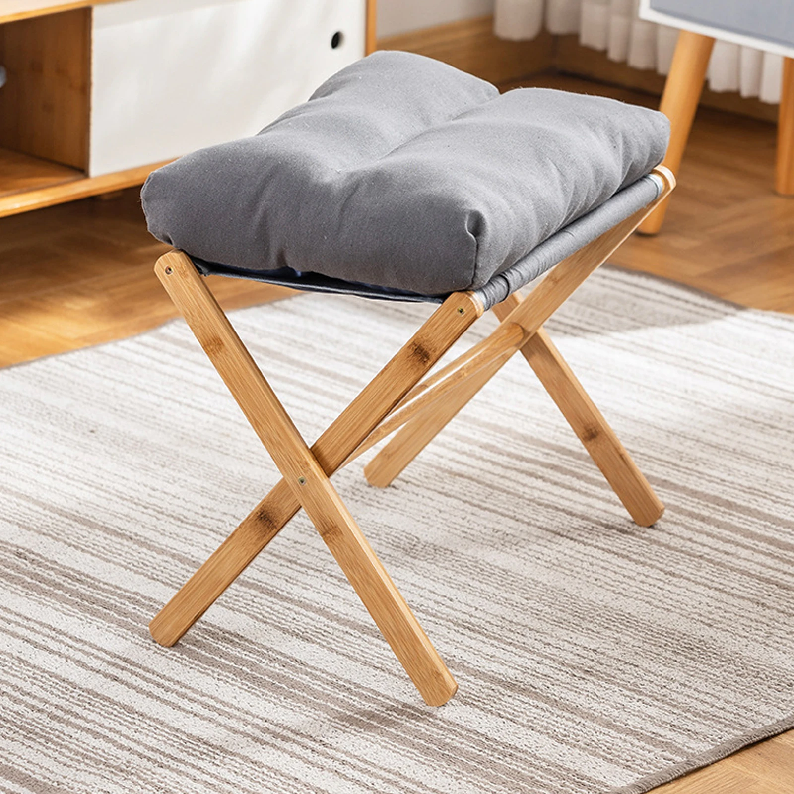Features: 1.Foldable Sofa Stool: The foldable low stool serves efficiently as a standalone mini stool chair or as a shoe stool to enhance relaxation when used with a lazy chair or sofa. 2.Sturdy Construction: Featuring an X-shaped design with a cotton cushion, this portable footrest offers both comfort and stability. Its solid bamboo X-frame legs ensure strong support for heavy weights. 3.Dimensions & Capacity Shoe Stool: Measuring 21 inches long by 11.8 inches wide and 18.11 inches high, this foldable sofa stool tucks easily under desks or vanities. With a maximum capacity of 300 lbs, it doubles as an additional side chair in various rooms. 4.Portable Design: The foldable sofa stool is lightweight and opens quickly for easy storage. Its compact foldable design makes it for outdoor events or breaks, ensuring you can rest anywhere. 5.Easy Assembly: Accompanied by all necessary accessories and instructions, this foldable low stool can be assembled in 10-15 minutes. For any questions, contact us for a response within 24 hours.