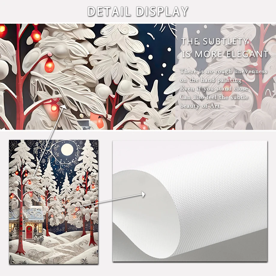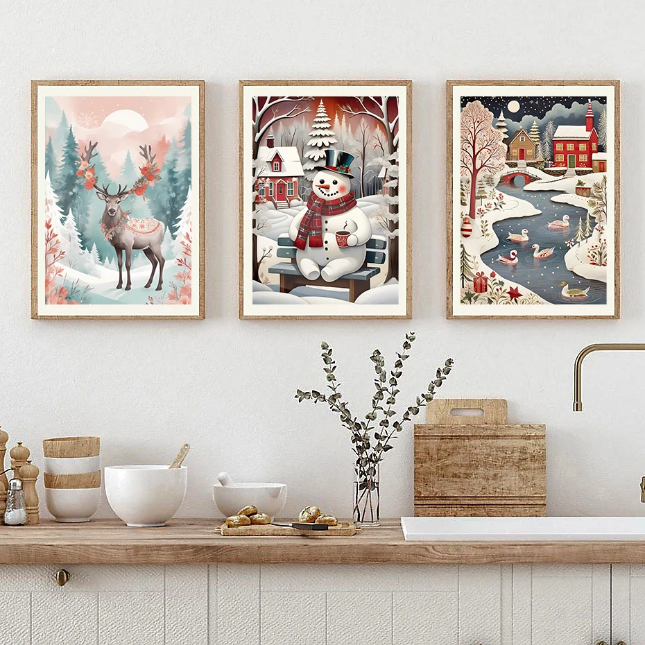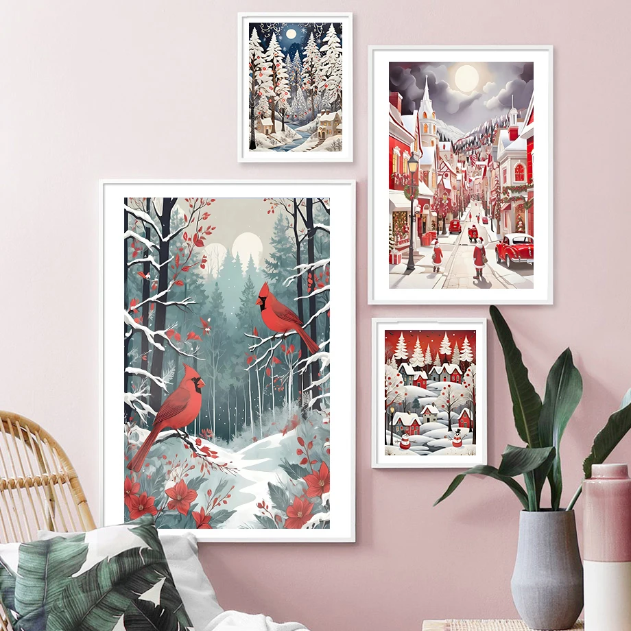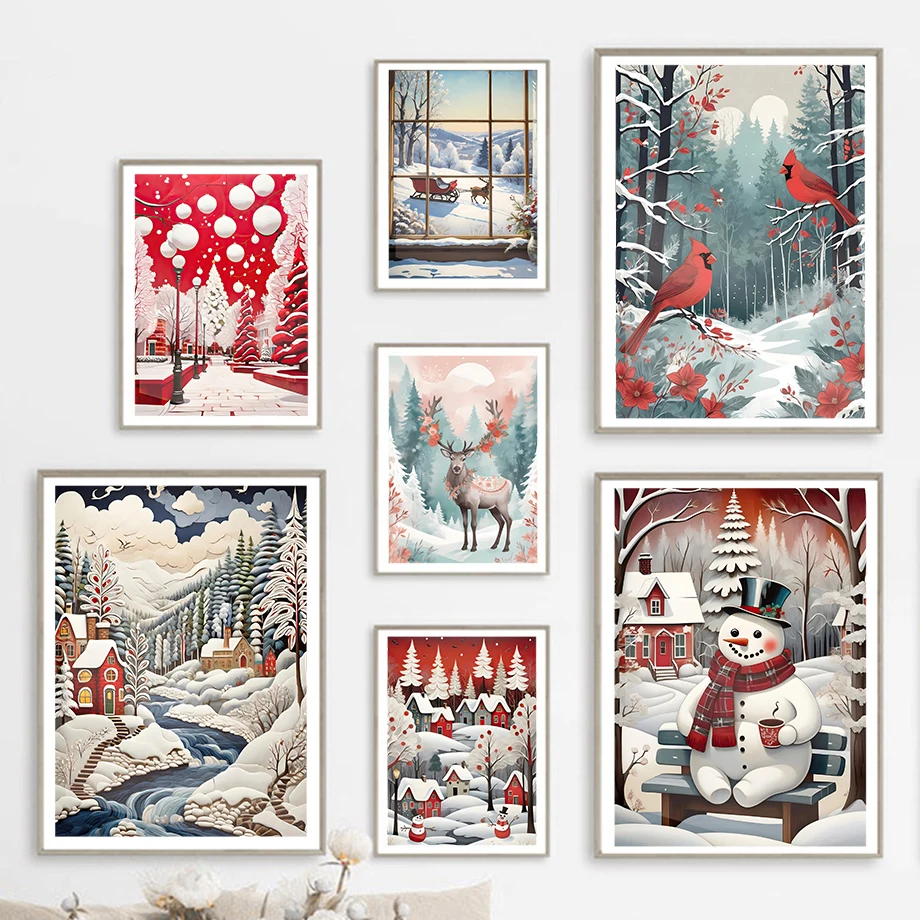 Folk Art Christmas Holiday Decorations Outside View Forest Snow Scene Fashion Wall Art Canvas Painting Nordic Poster Room Decor