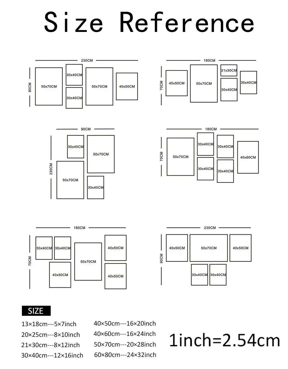 13cmX18cm, 20cmX25cm, 21cmX30cm, 30cmX40cm, 30cmX42cm, 40cmX50cm, 40cmX60cm, 50cmX70cm, 50cmX75cm