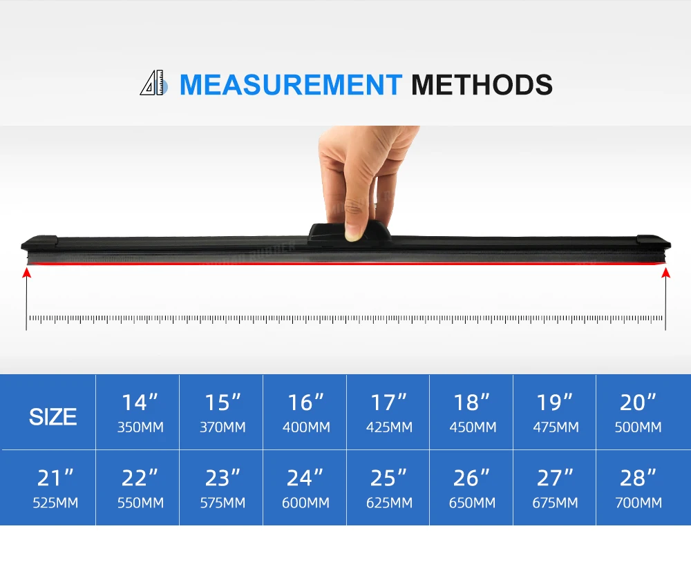 1: When measuring the wiper, it is necessary to press the wiper horizontally and measure the length of the wiper strip. It is best to check if the size is the same as the original car wiper before purchasing.