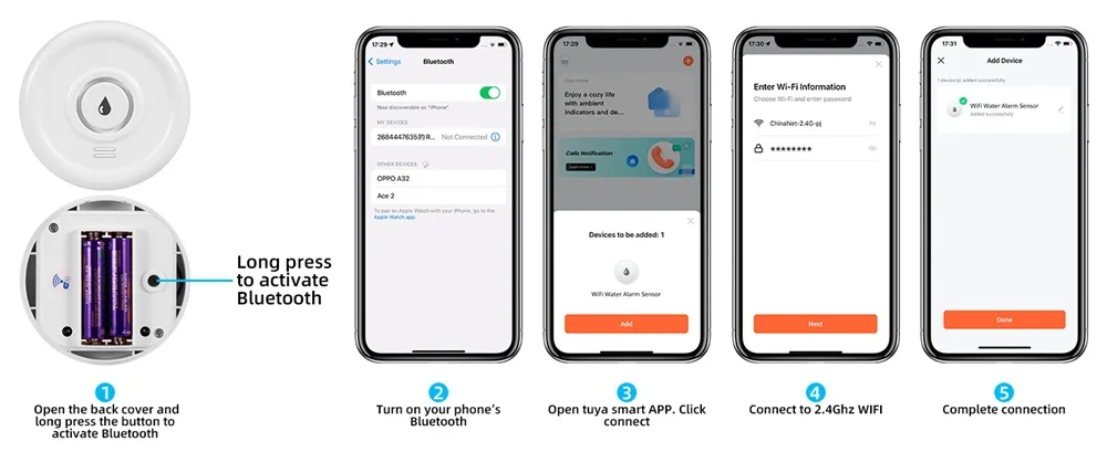 Connected to the Tuya app easily. The signal is very loud, like a fire alarm. If you wipe off the water, the signal stops. The app shows the battery level. If you use 1.2 volt batteries, the charge is 60%. Or use 1.5 volt lithium batteries.