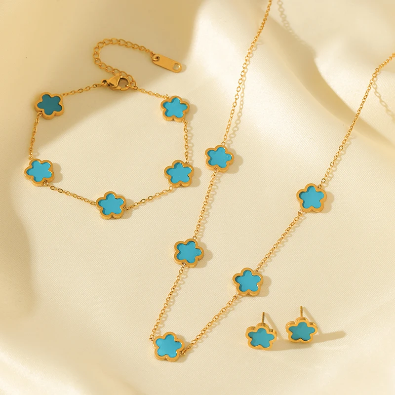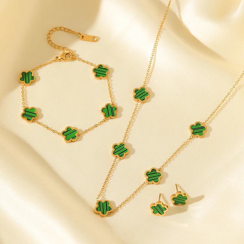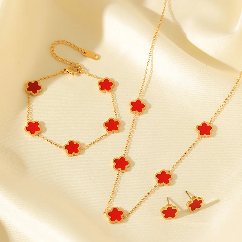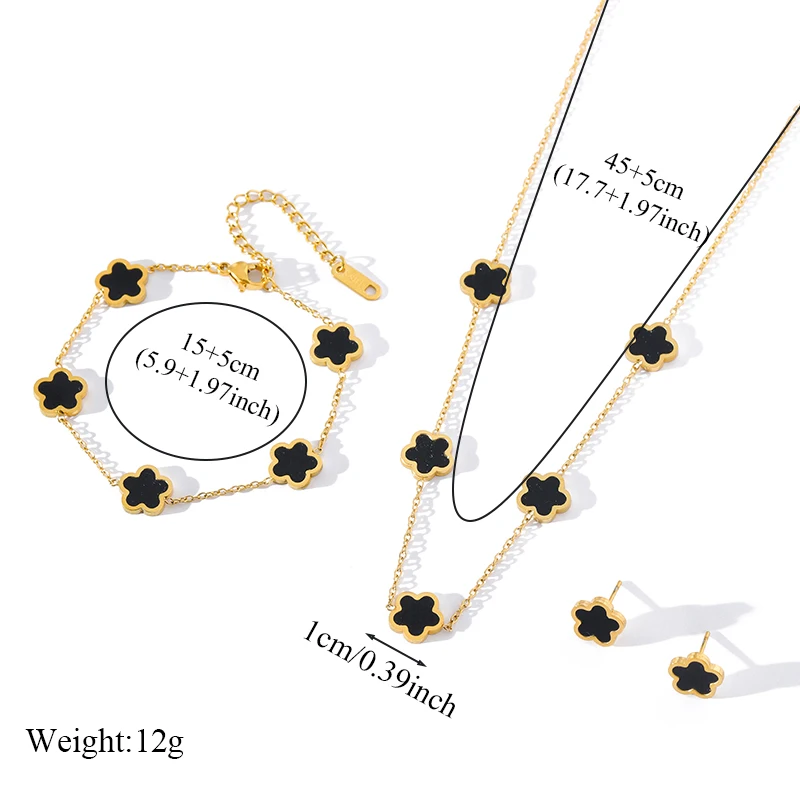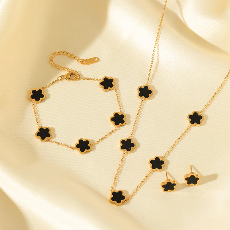 GANEMLY 316L Stainless Steel Black Plum Flower Five Leaf Clover Necklace Bracelet Earrings Jewelry Set For Women Birthday Gift