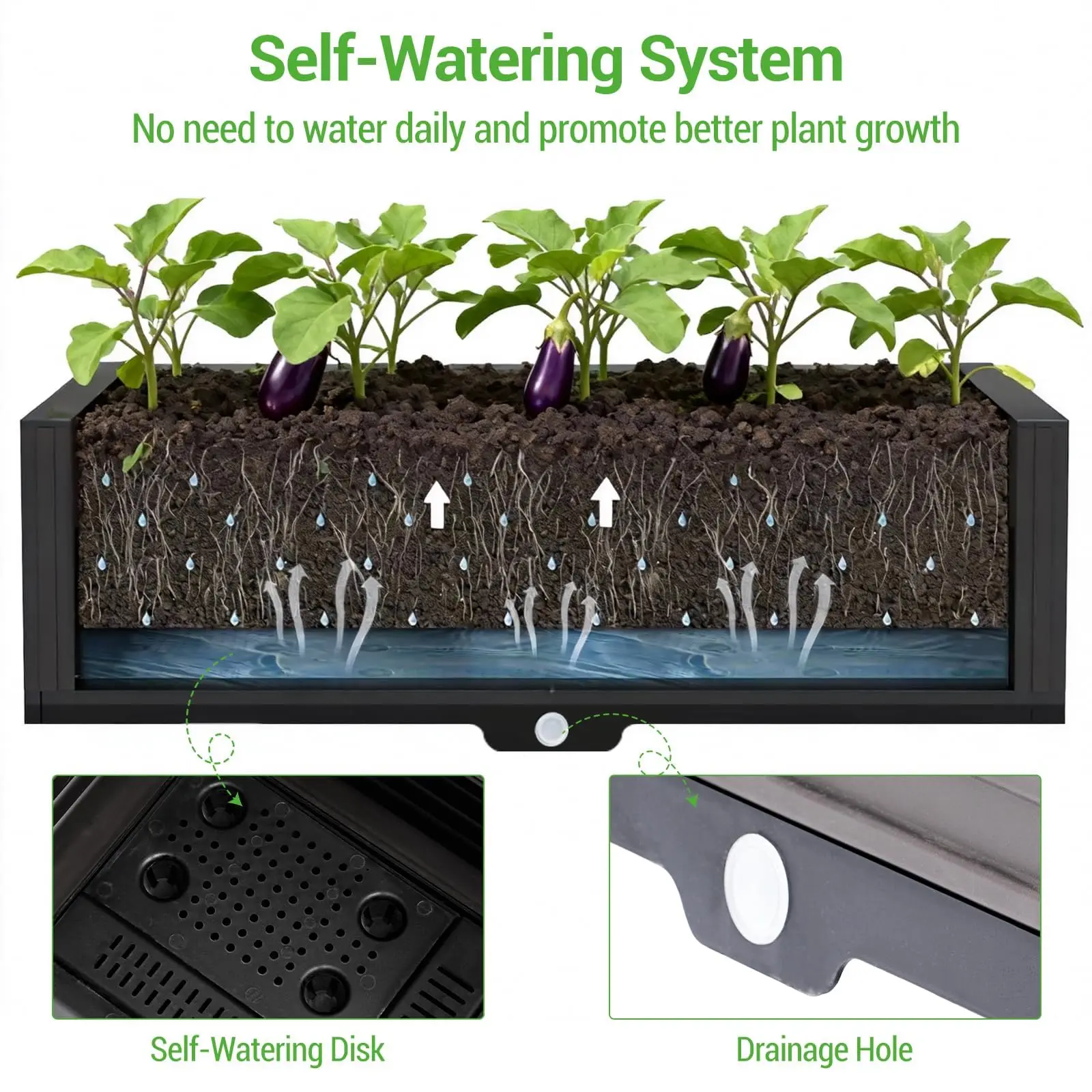 • Automatic Watering System: This raised garden bed features a water reservoir at the bottom that keeps the soil evenly moist during the hot summer months. This eliminates the need for daily watering and reduces maintenance costs. A white plug on each side of the planter allows for drainage and retains excess water, ensuring optimal plant aeration.