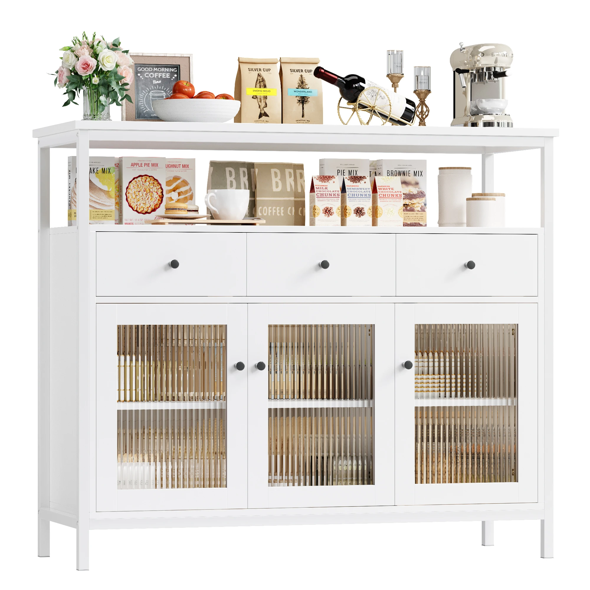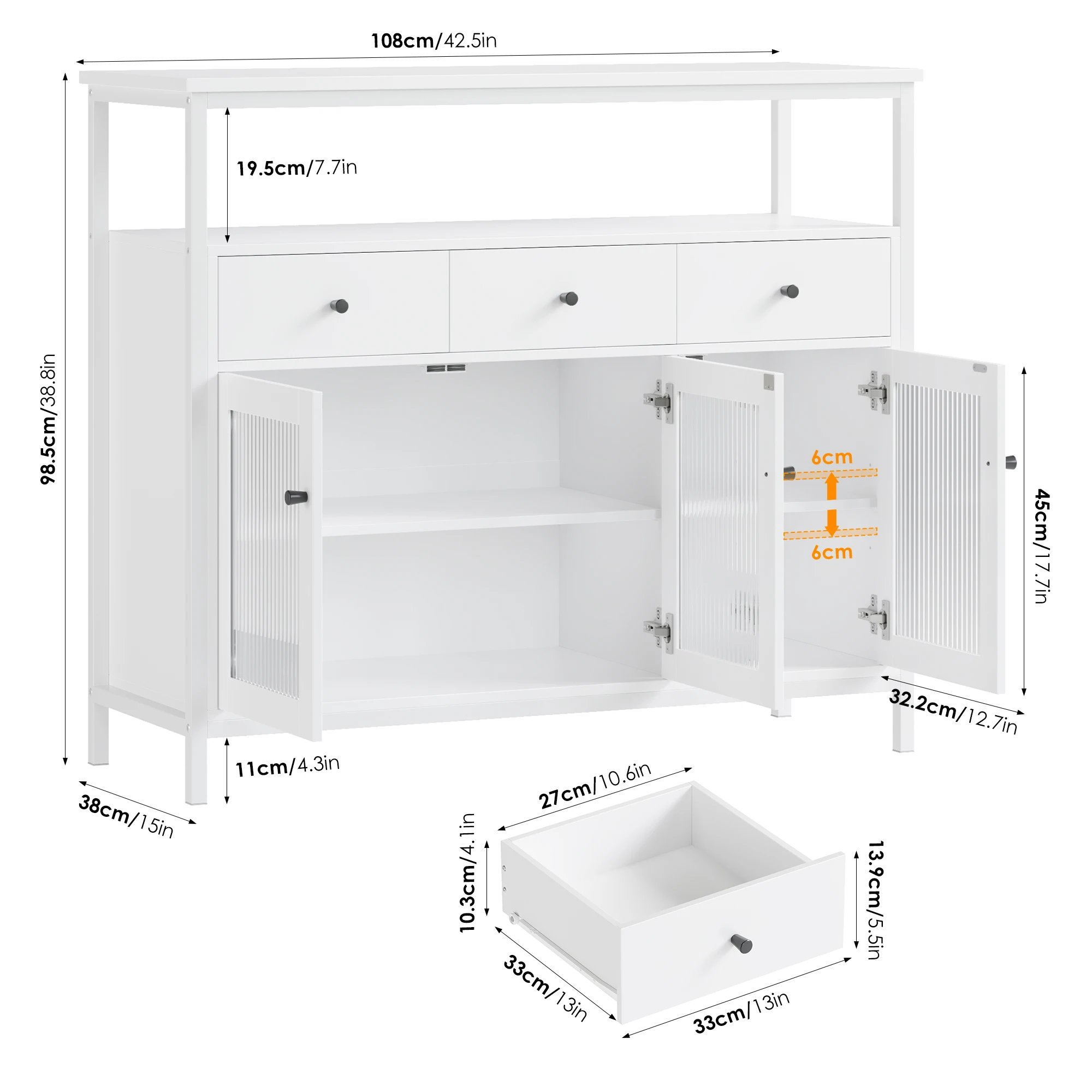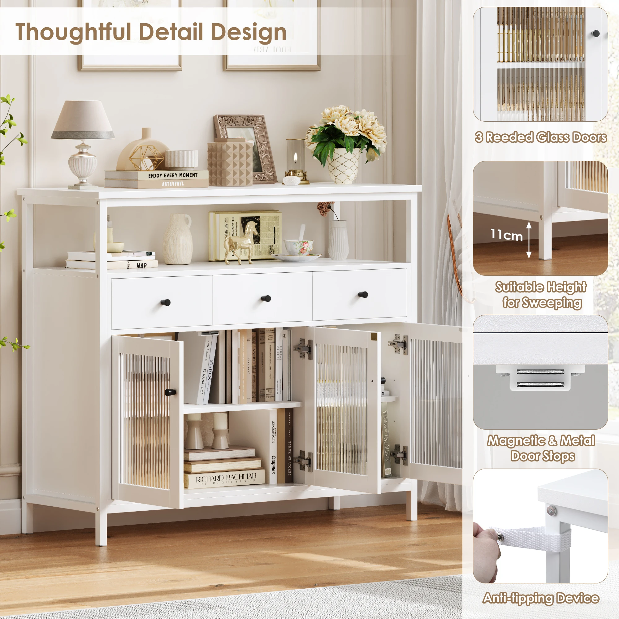 Getone Sideboard Kitchen Storage Cabinet Buffet White Cupboard with Drawers 3 Glass Doors for Living Room 108x38x9