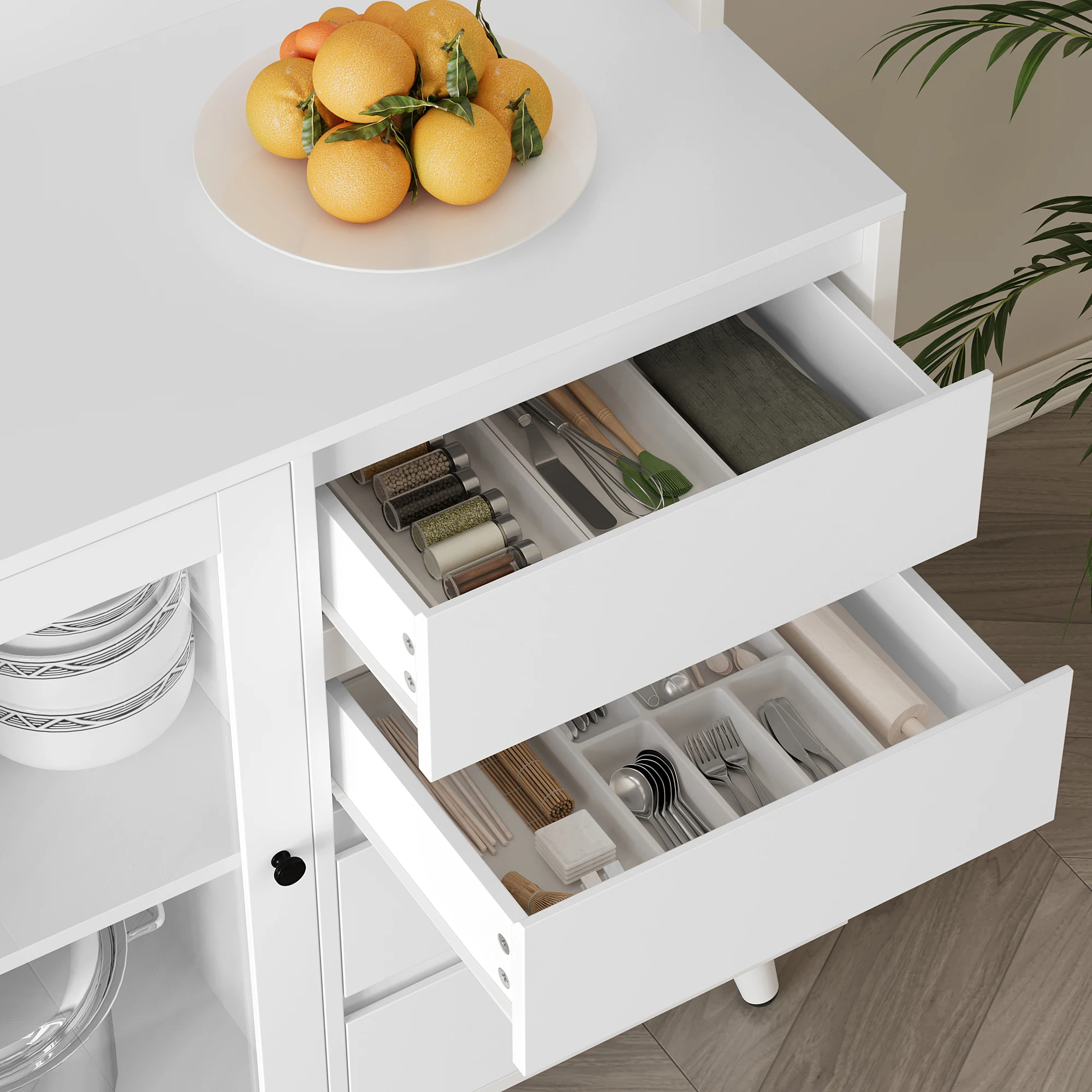 This kitchen wardrobe has two glass-door storage hand fan and an open compartment, plus 4 drawers and a generous work plate in the middle. He is a great option for storage in the kitchen and dining room.