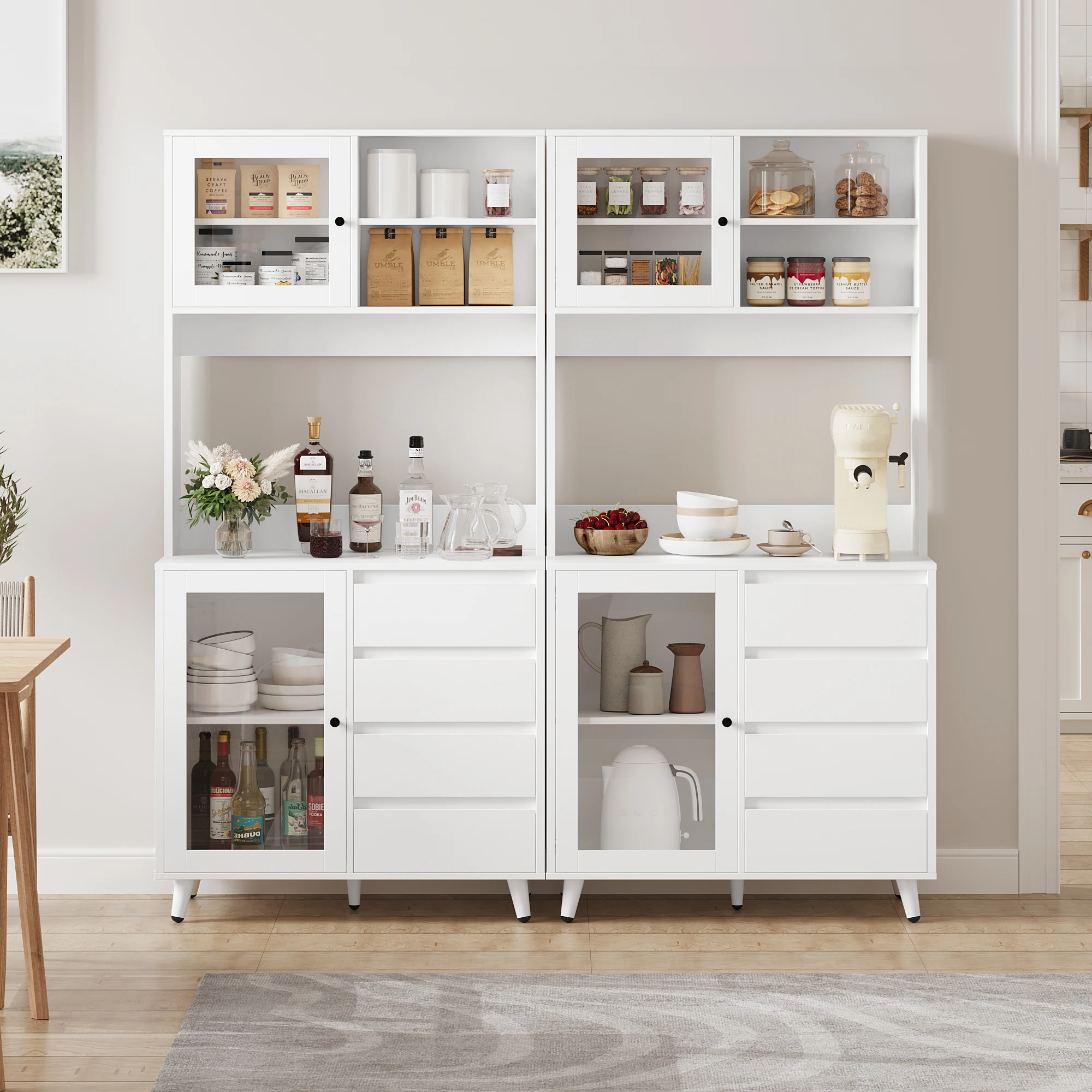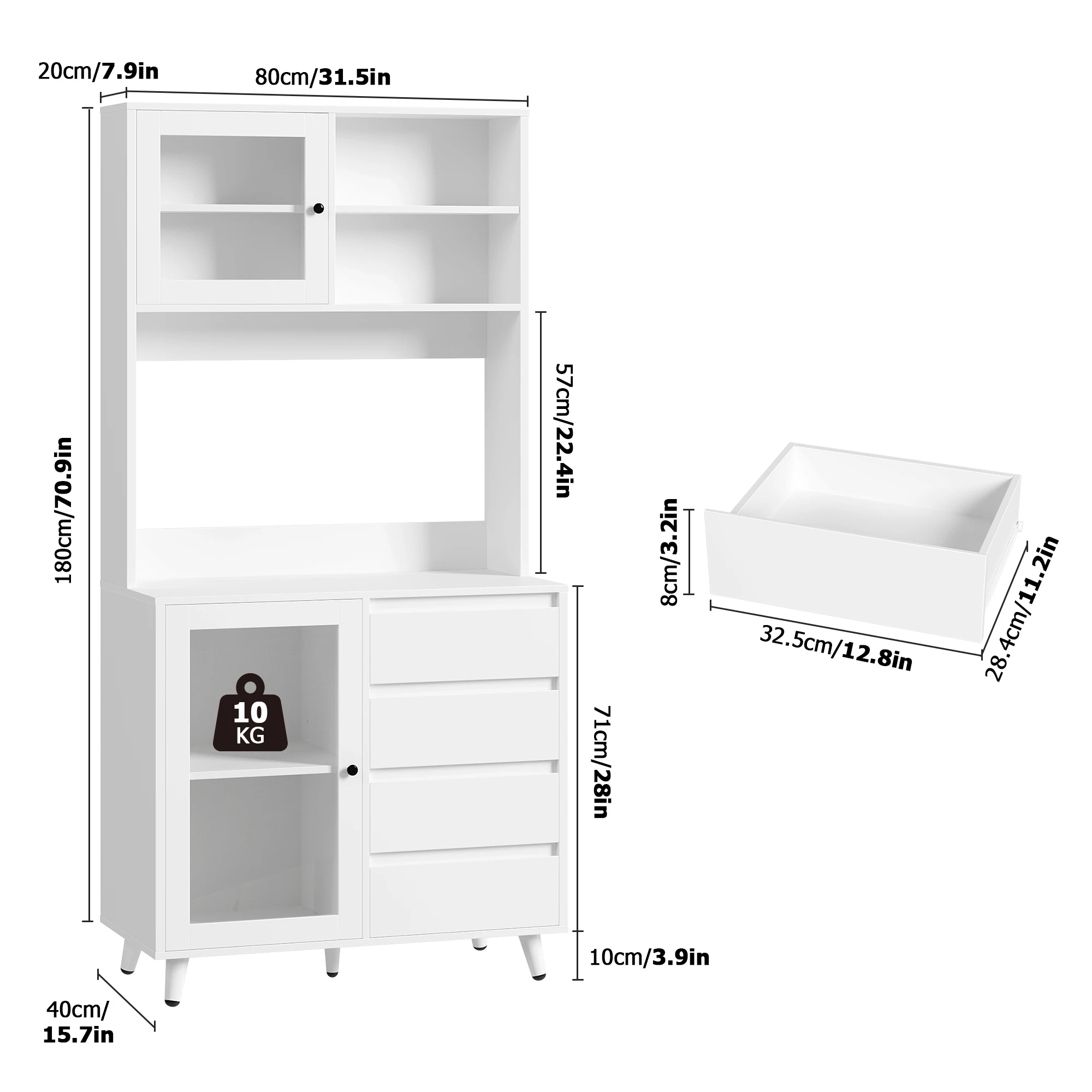 Getone Tall Kitchen Cupboard, 180cm Tall Storage Cabinet, Sideboard Pantry Cabinet with 4 Drawers, Glass Doors, Countertop White 180x80x40cm