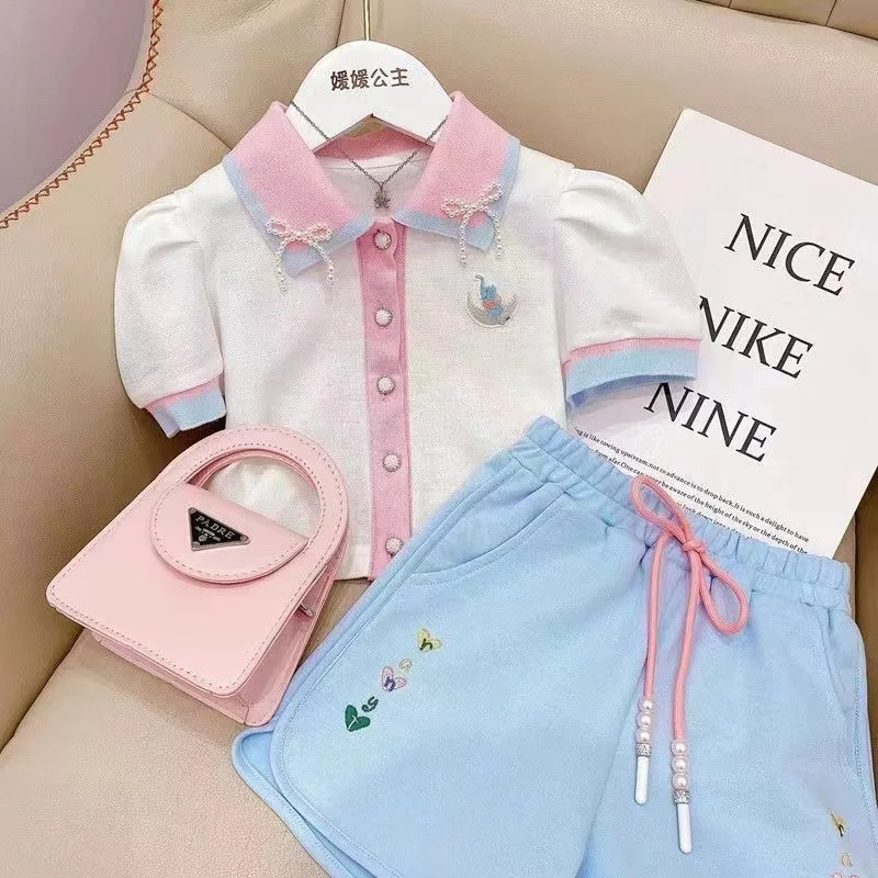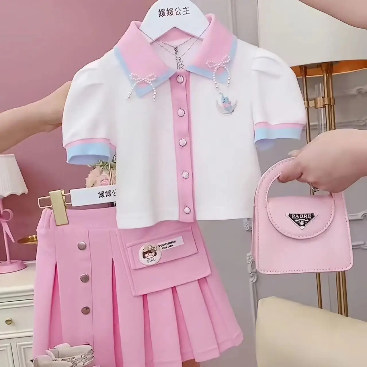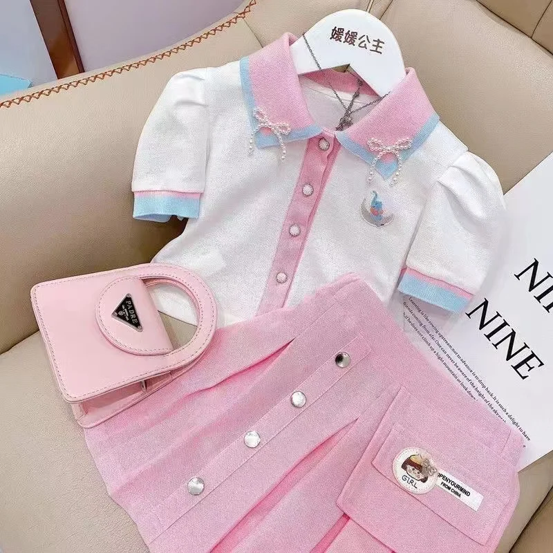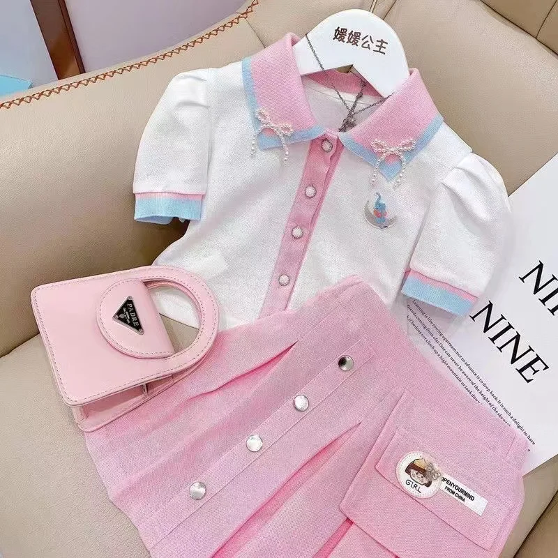 Girls’ Small Fragrance Set 2024 New Polo Collar Spliced Summer Short Sleeve Pleated Skirt Two Piece Set Trendy