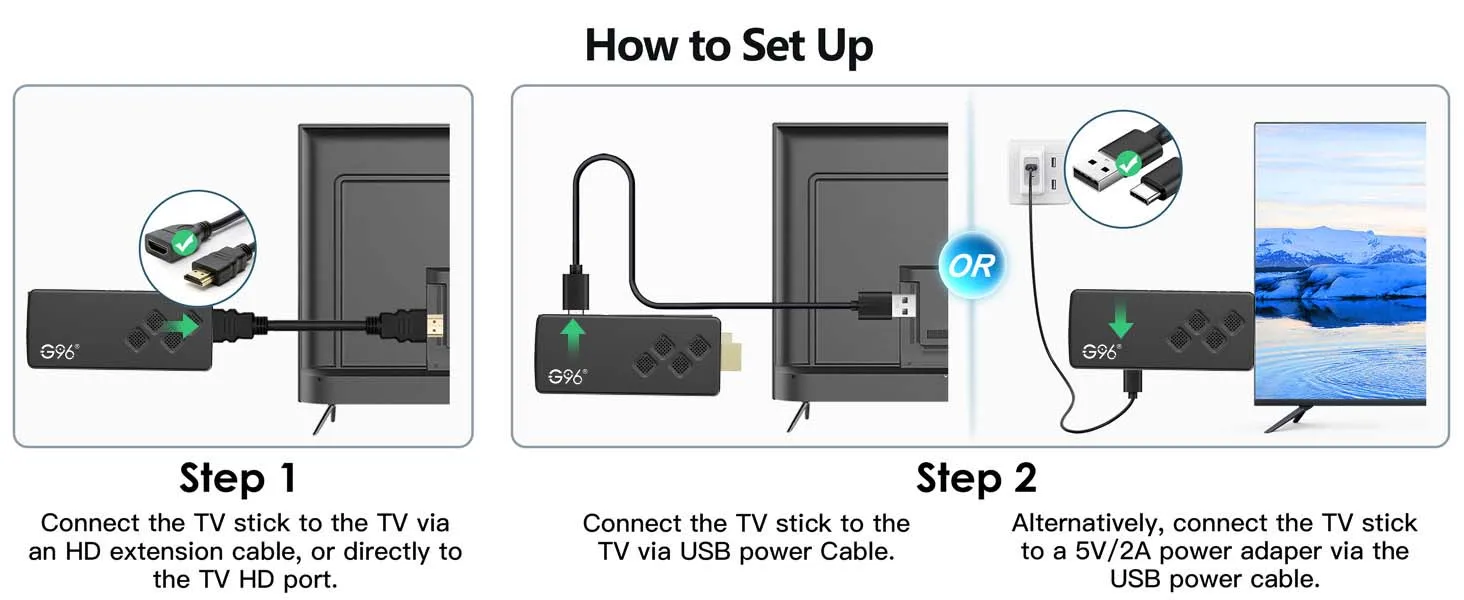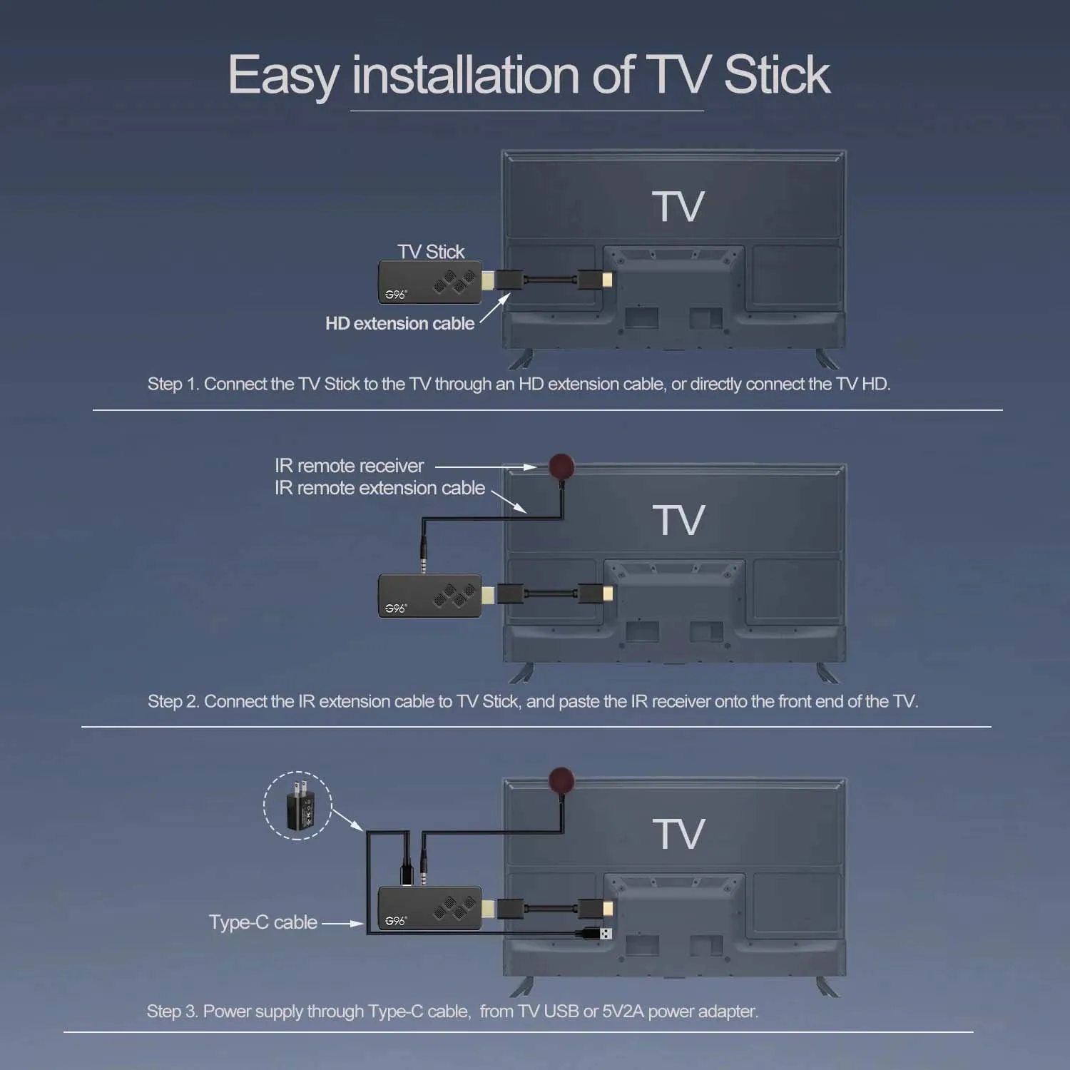 2: Use a 5V, 2A power plug to connect the TV Stick to the power supply, and insert the TV Stick into the infrared signal receiving cable