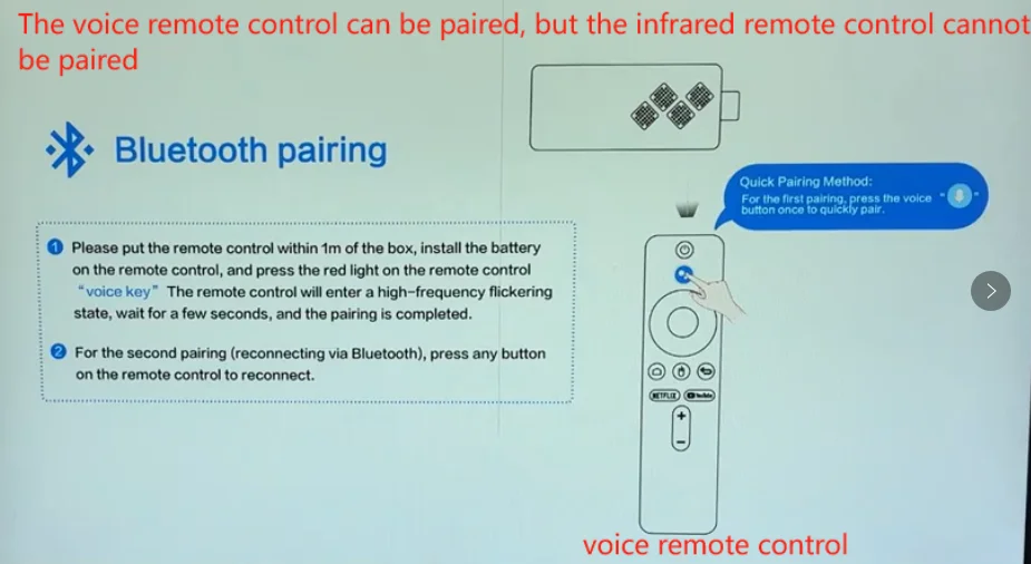 2. If you purchased a voice remote control combination, the pairing interface will appear. You need to perform Bluetooth pairing according to the interface prompts: press and hold the remote control button at the same time. When the pairing interface automatically exits, it means that the pairing is successful. Release the button after the pairing is successful.
