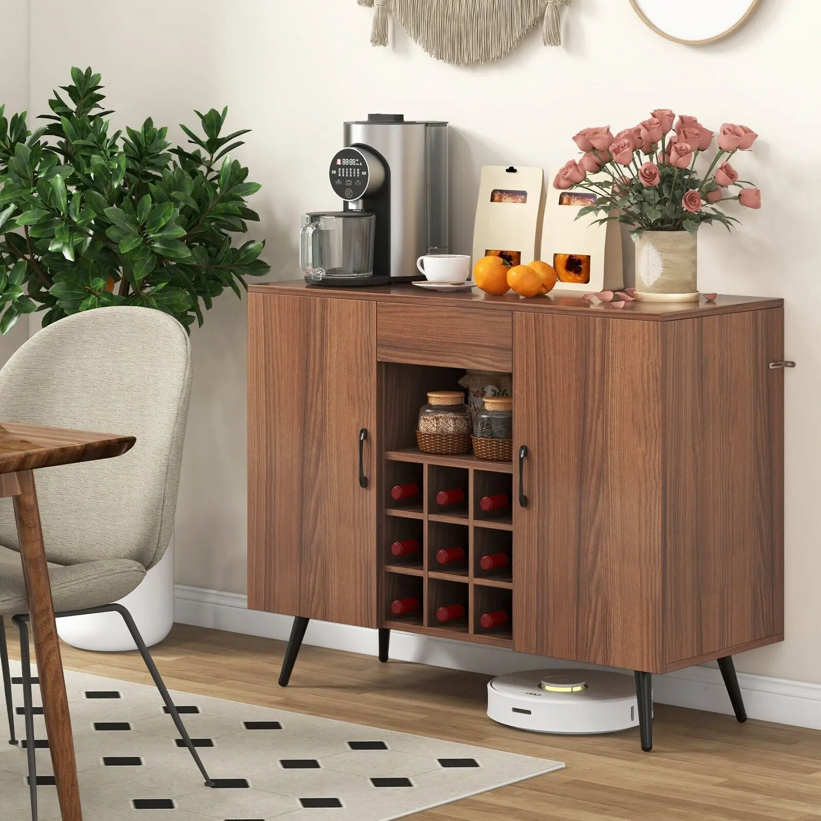 Introducing the ultimate wine lover’s dream: The versatile buffet cabinet! This stunning piece is not only a decorative centerpiece, but also a convenient storage solution for your prized wine collection. Boasting a removable 9-bottle wine rack, the liquor cabinet offers easy access to display your favorite vintages. Need more than just wine? No problem! This incredible sideboard also features a spacious tabletop, pull-out drawer, open compartment, and 2 single door cabinets, giving you plenty of options to keep your space organized. With adjustable shelves to accommodate items of all sizes, you’ll have endless versatility. It’s not just practical either, the sleek wood grain and metallic accents create a timeless mid-century modern elegance that will elevate any room.