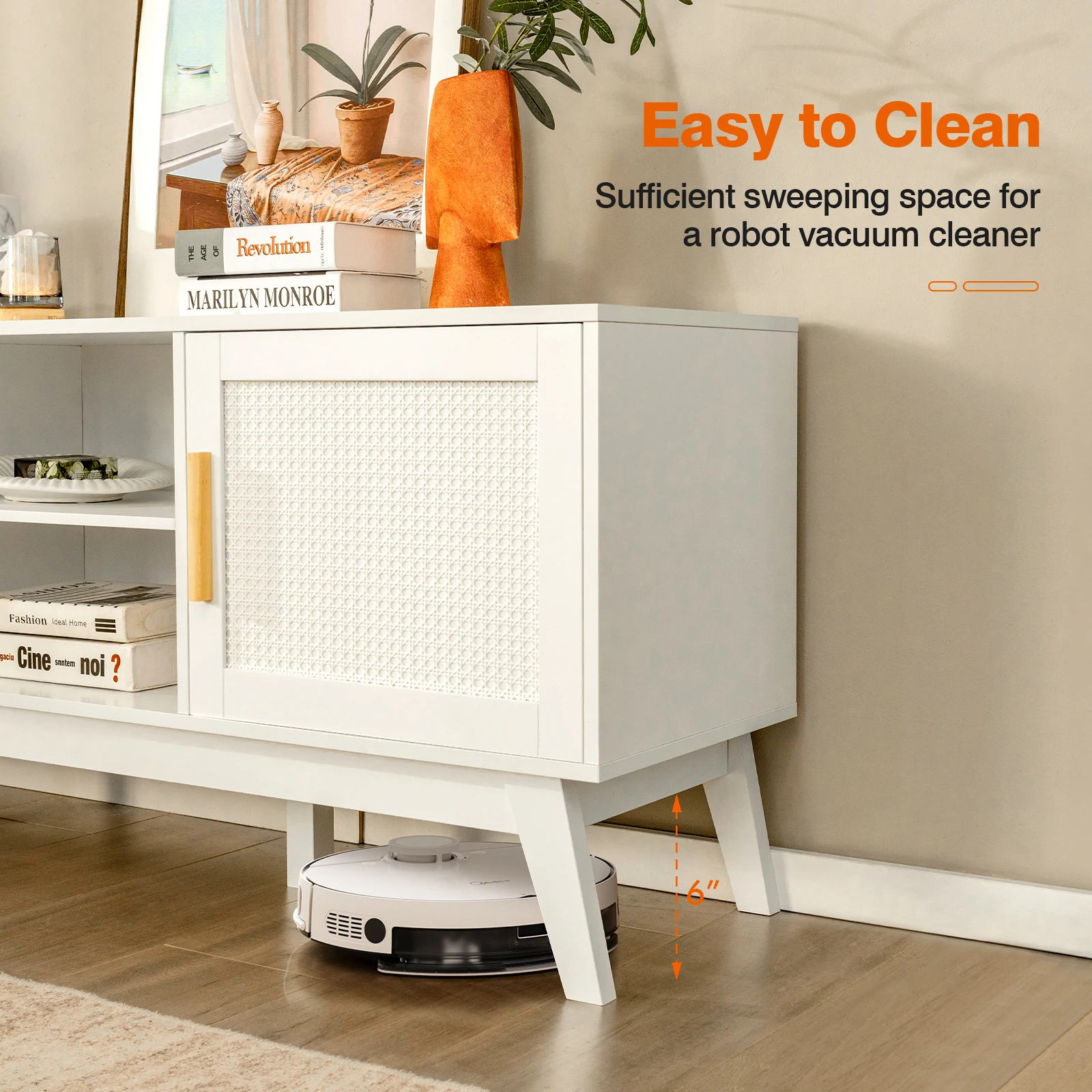 This TV Entertainment center can fulfill all your living room needs and requirements while giving a gracious living Style. Its spacious tabletop for TV ups to 65″, 2 cabinets with adjustable shelf, open shelves, can meet your storage and display needs. This media console is supported by 6 legs that ensure sturdiness and durability. Our TV stand is a piece of multi-purposely designed furniture that can be used in your living room, bedroom, hallway, and game roo. The seamless blend of natural rattan with contemporary design ensures it will complement a variety of interior styles, making it the perfect choice for a modern and organized home.