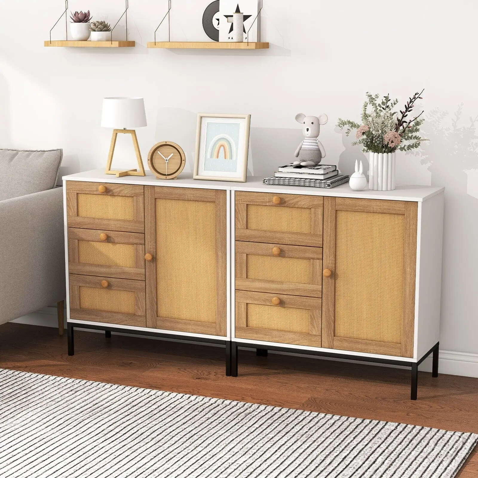 The sideboard features an artificial rattan front panels, which makes it an eye-catching addition to any room in your home, such as living room, bedroom, dining room, etc. The 2-tier cabinet and 3 drawers provide roomy storage space. Made of premium materials, this buffet table has a sturdy frame. And metal legs ensure better stability. Plus, the drawers use metal drawer slides for reliable durability and smooth sliding.