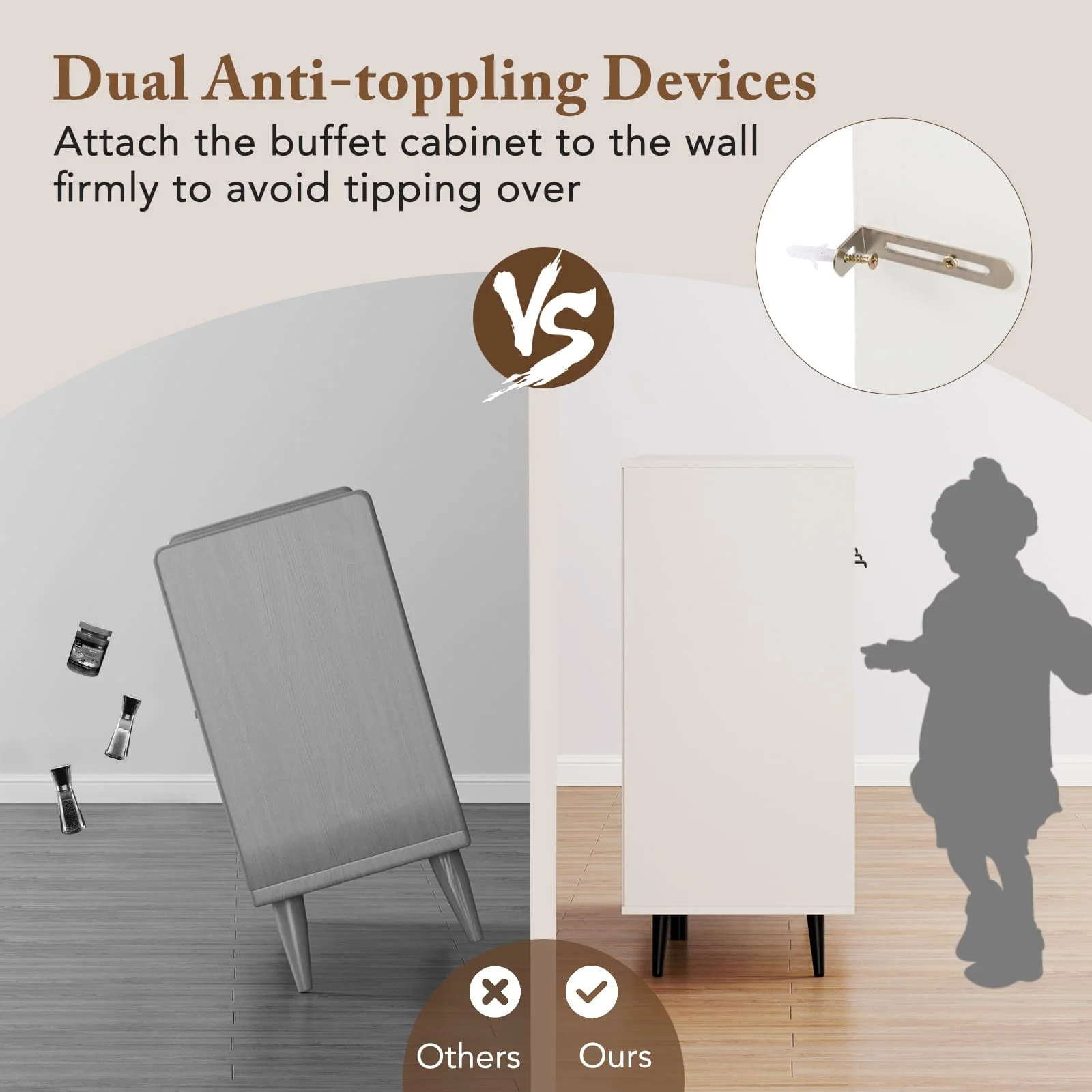 Dual anti-toppling devices ensure security by avoiding tipping over
