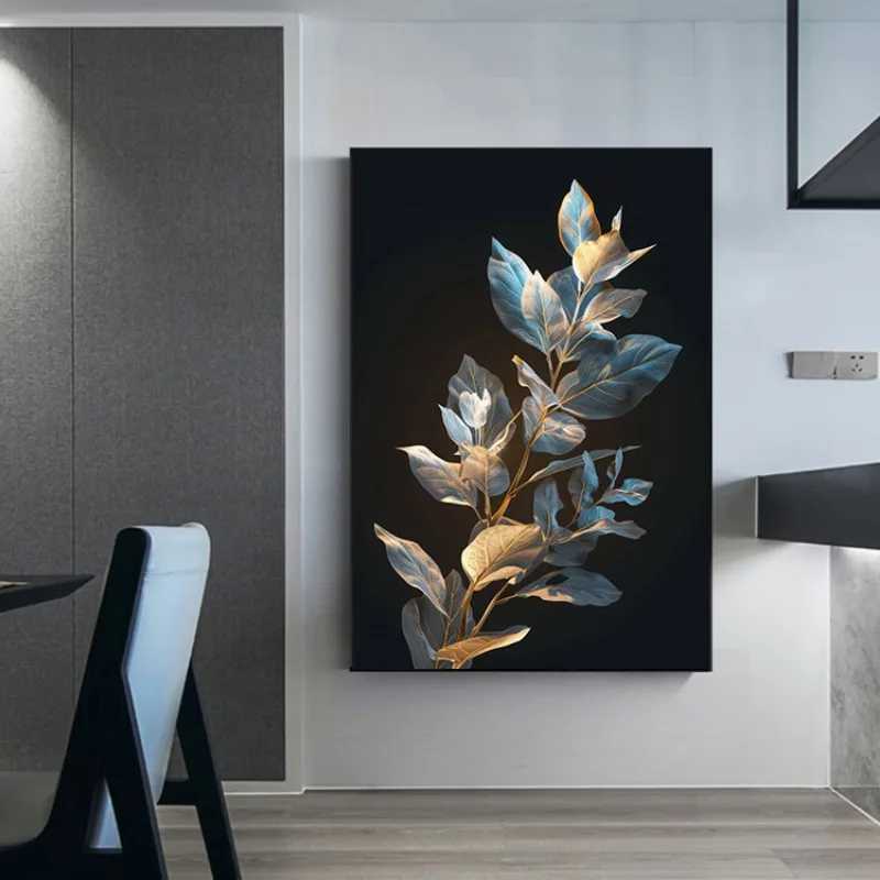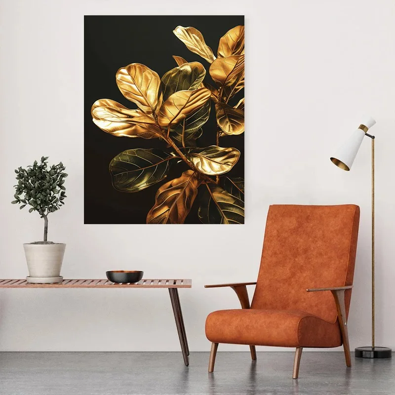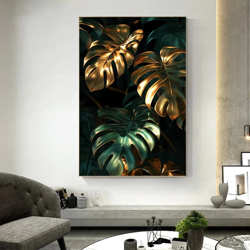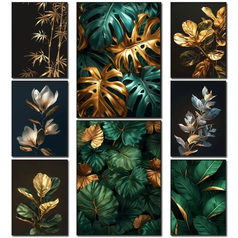 Gold Floral Elegant Green Dark Gold Leaf Nature Decor Poster Minimalist Succulent Bamboo Leaves Luxury Canvas Picture Wall Decor