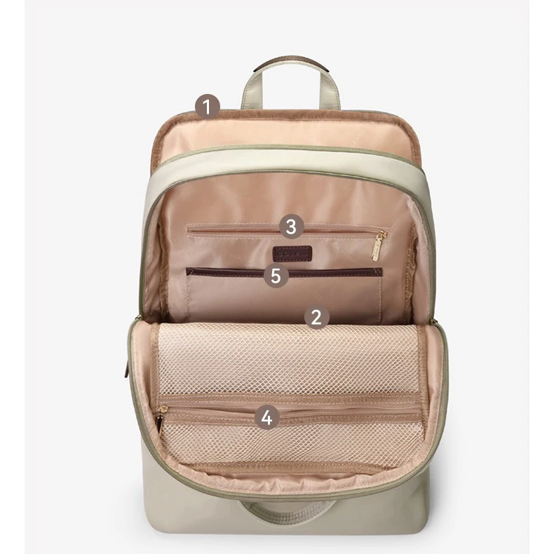 Internal: 1 main compartment, 1 inner back pocket, 1 inner back zipper pocket, and 1 front mesh pocket.