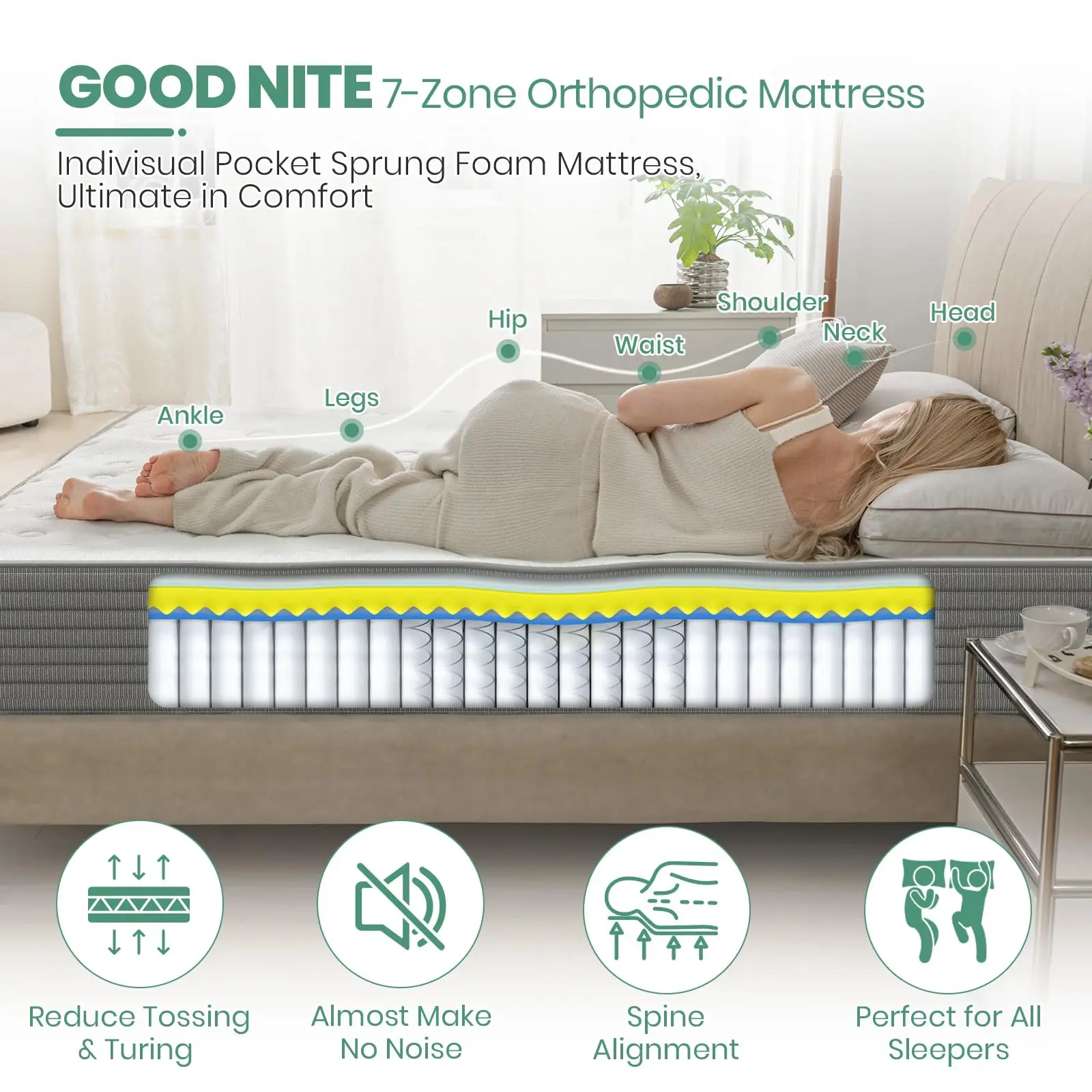 Silent & Motion-Free Sleep – The individually wrapped pocket springs absorb noise and motion, ensuring you and your partner enjoy undisturbed sleep. Perfect for light sleepers, this mattress minimizes disruptions caused by movement.