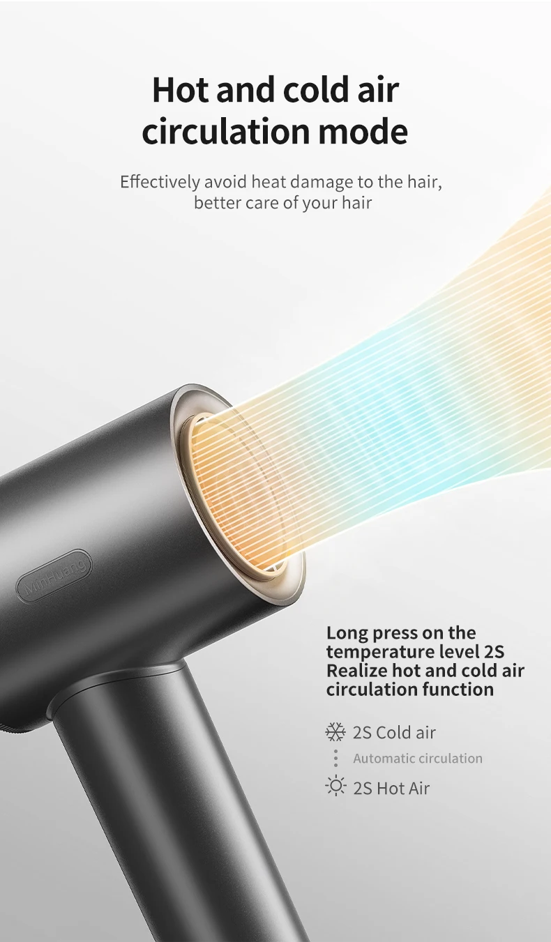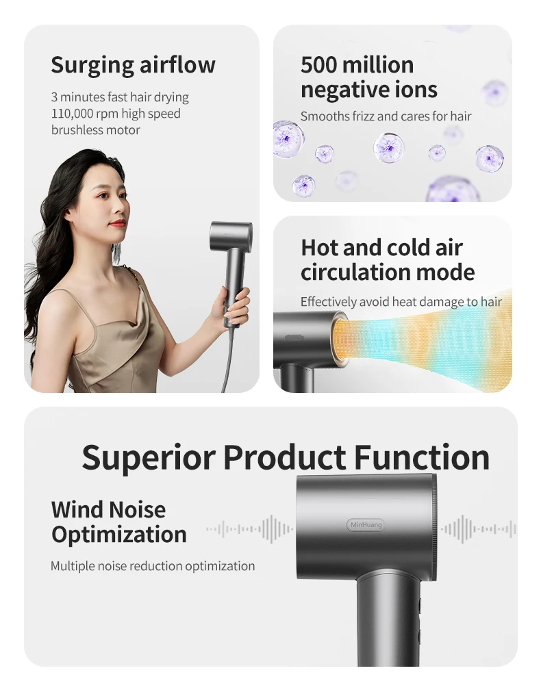 • High-Speed Negative Ions :Operating at 110,000 rpm with high-speed negative ions, it provides a professional-grade hair care experience, reducing frizz and leaving your hair smooth and shiny.