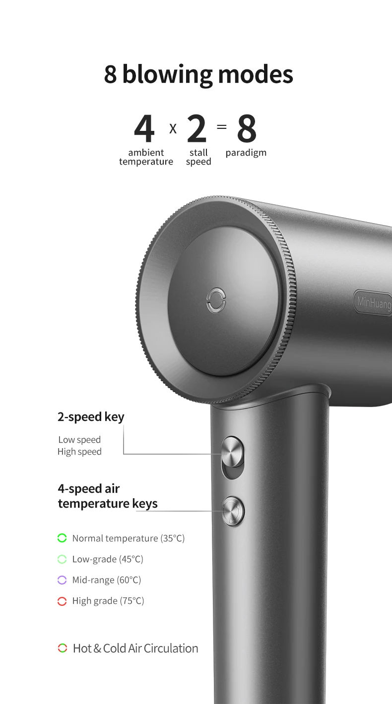 ● Provides 8 different drying combinations, including 2 wind speeds and 4 temperature settings, suitable for various usage scenarios.
