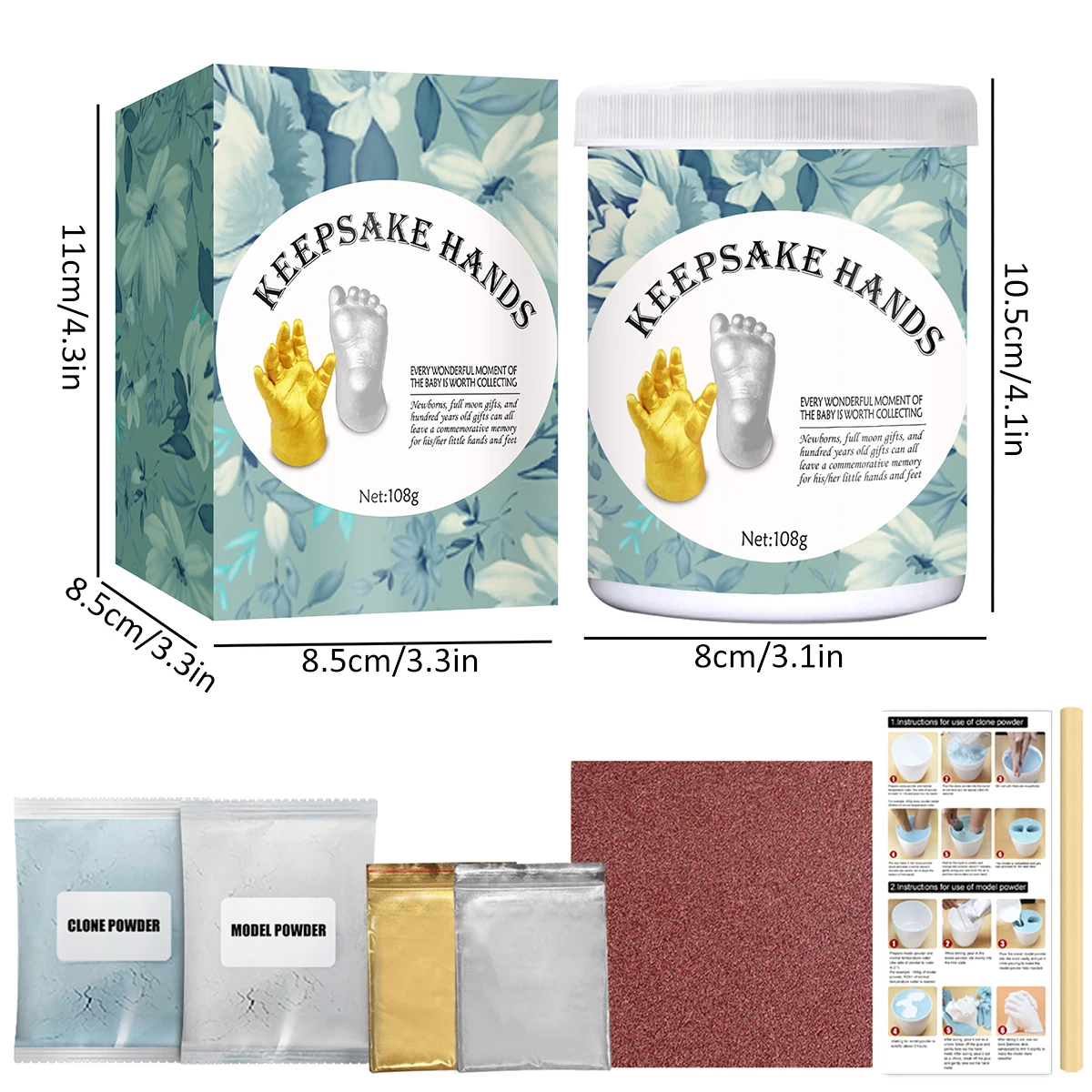 The hand-sculpting kit contains everything you need to make souvenirs for newborn hands and feet. It includes 50g clone powder, 50g model powder, 4g gold powder, 4g silver powder, a poking bar, sandpaper, and an instruction manual.