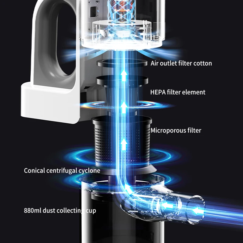 HEPA Filter + Microporous Filter + Conical Cyclone: Traps 99.97% of dust and allergens.