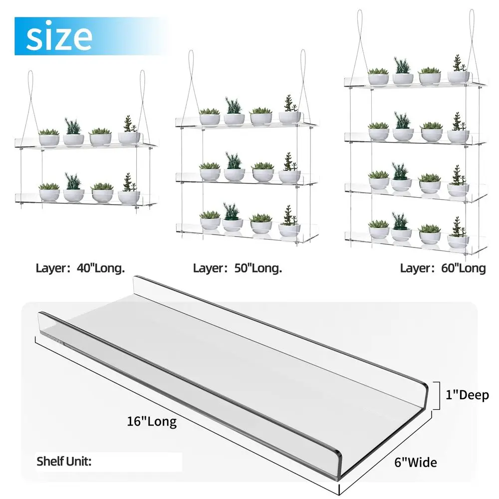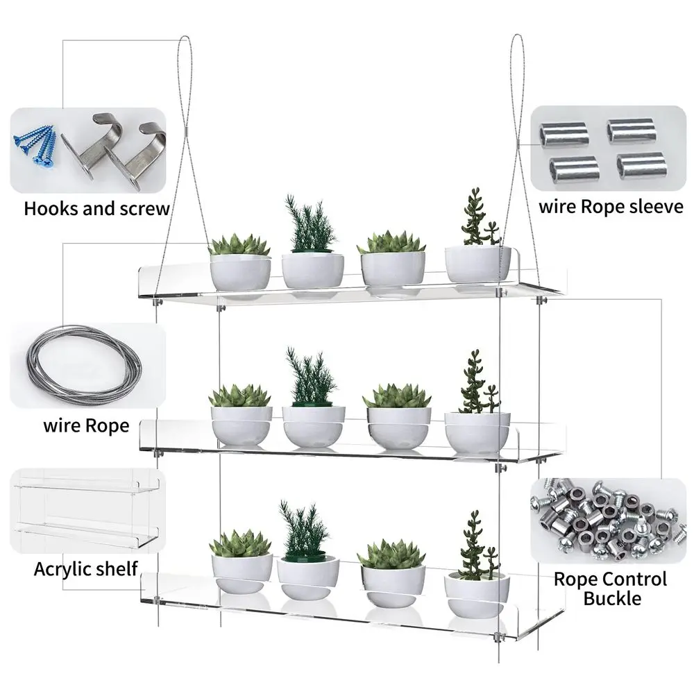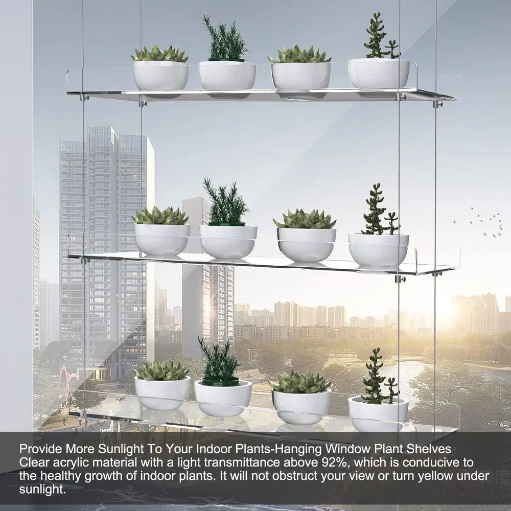 HANGING SUPER CLEAR PLANT SHELVES3Tier clear acrylic hanging window plant shelves. the transparent design allows natural light to pass through and provides rich sunlight for indoor plants with a sunlight transmittance attain 95, maximizing the amount of sunlight that reaches your plants. This makes them ideal for use in spaces that may not receive a lot of natural light, such as basements or apartments, as well as for use with plants that require a lot of light to grow.