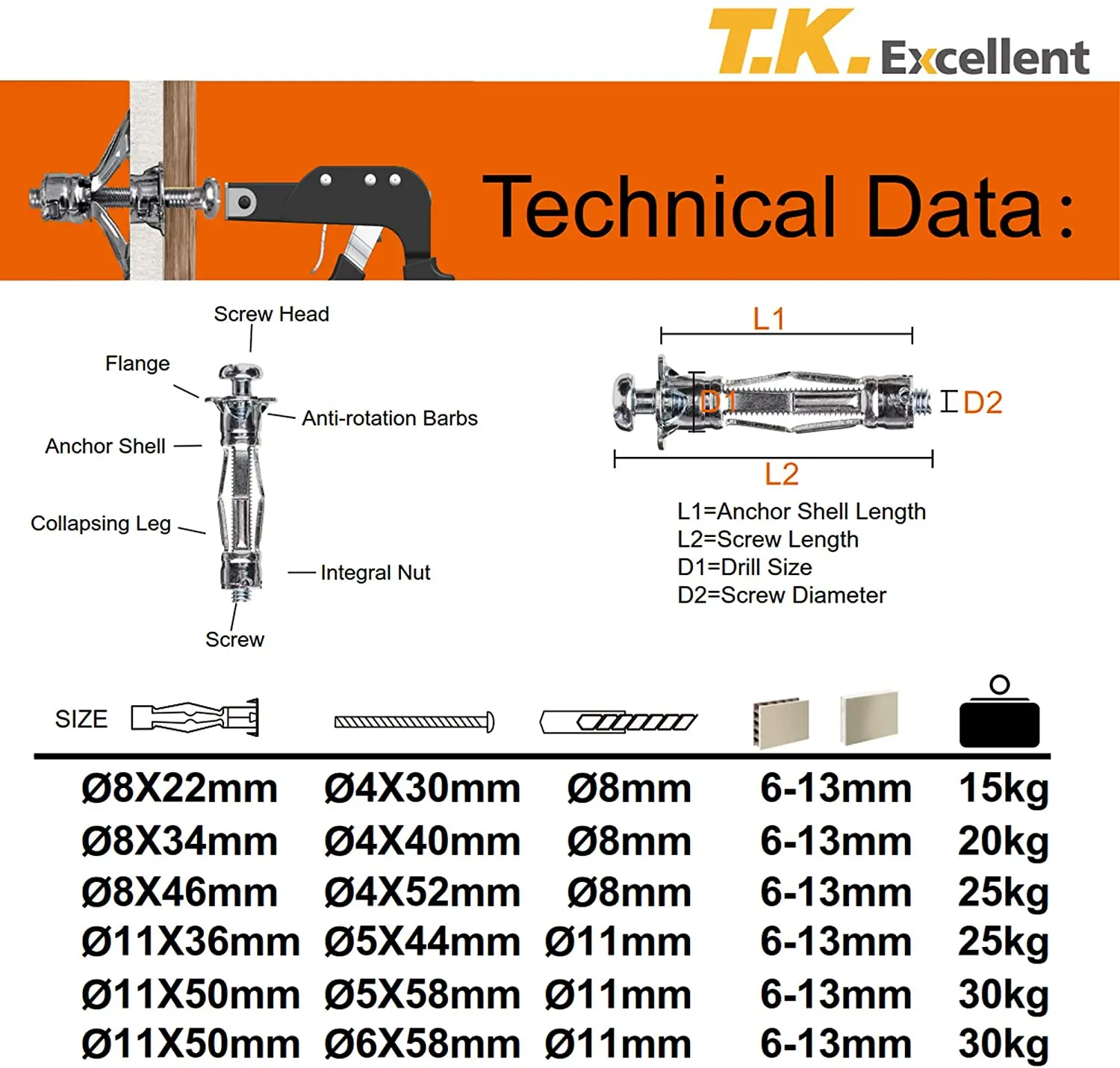 【Wide range of applications】:Perfect for cavity anchor plasterboard fixing, widely used in drywall, hollow block, plaster, tile, perfect for hanging
