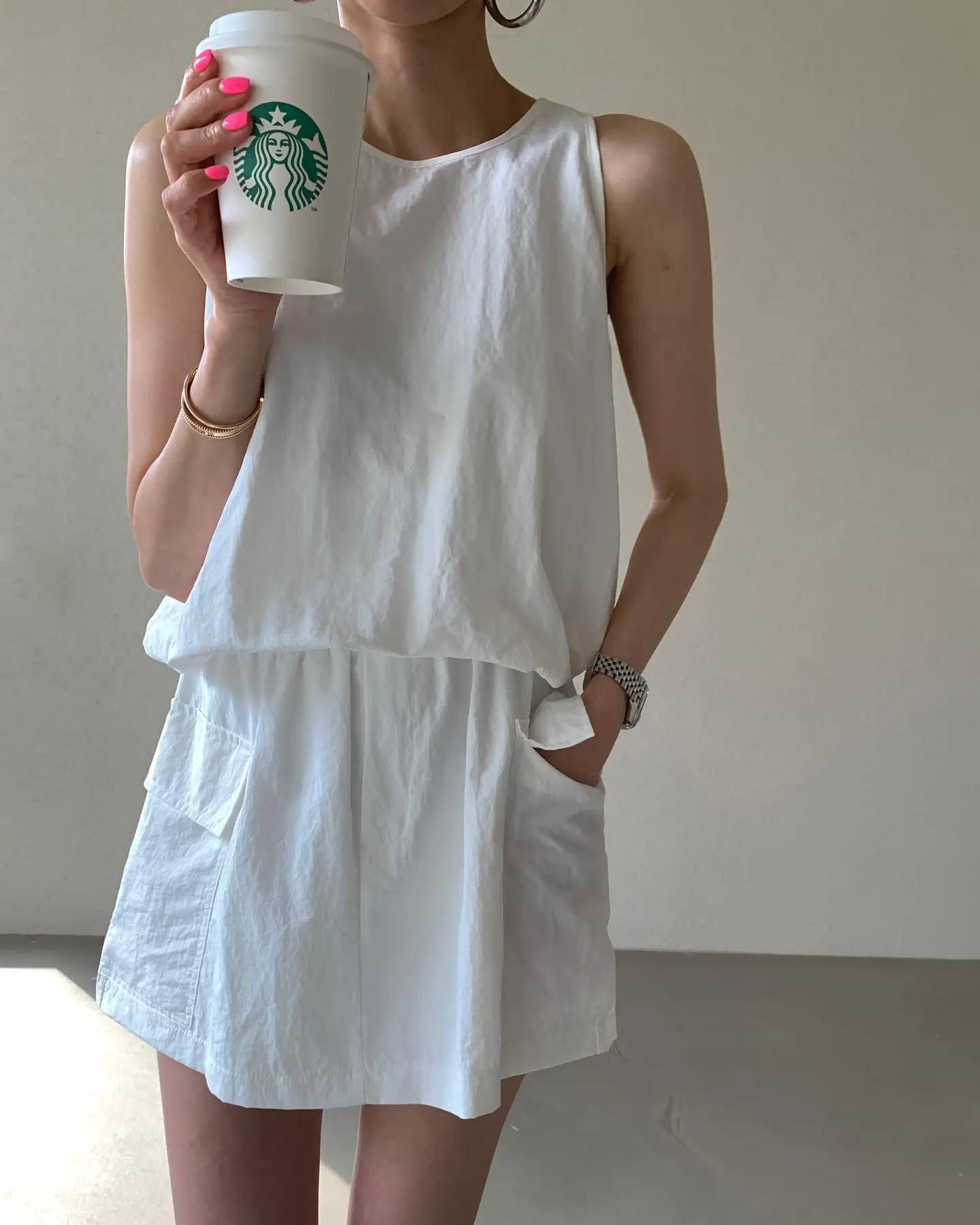 HELIAR Women Solid Color Casual 2 Piece Sets Zipper Sleeveless Vest Shirt +Elastic Waist Shorts Skirt Set Office Women Outfits