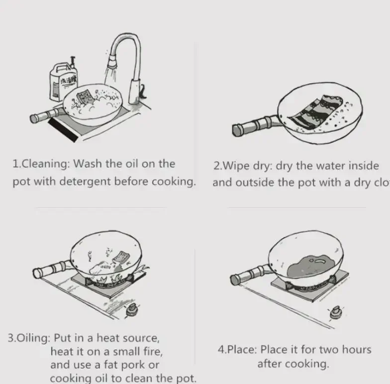 After each use of the iron pan, please clean the iron pan, dry it and coat it with cooking oil. This operation is not necessary after approximately 20 uses.