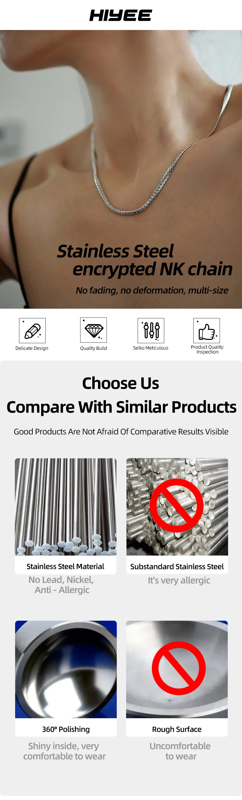HIYEE Fashion Classic 3-8MM Figaro Chain Stainless Steel Non-Fading Waterproof Necklace For Men’s And Women’s Parties