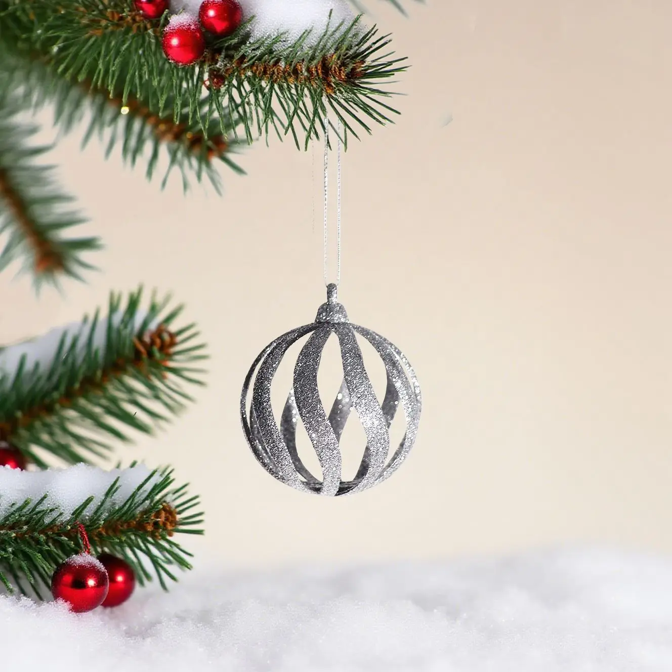 Enhance your holiday decor with this glittery, hollowed-out Christmas sphere, its unique open design allowing the light to shine through the sparkling interior.