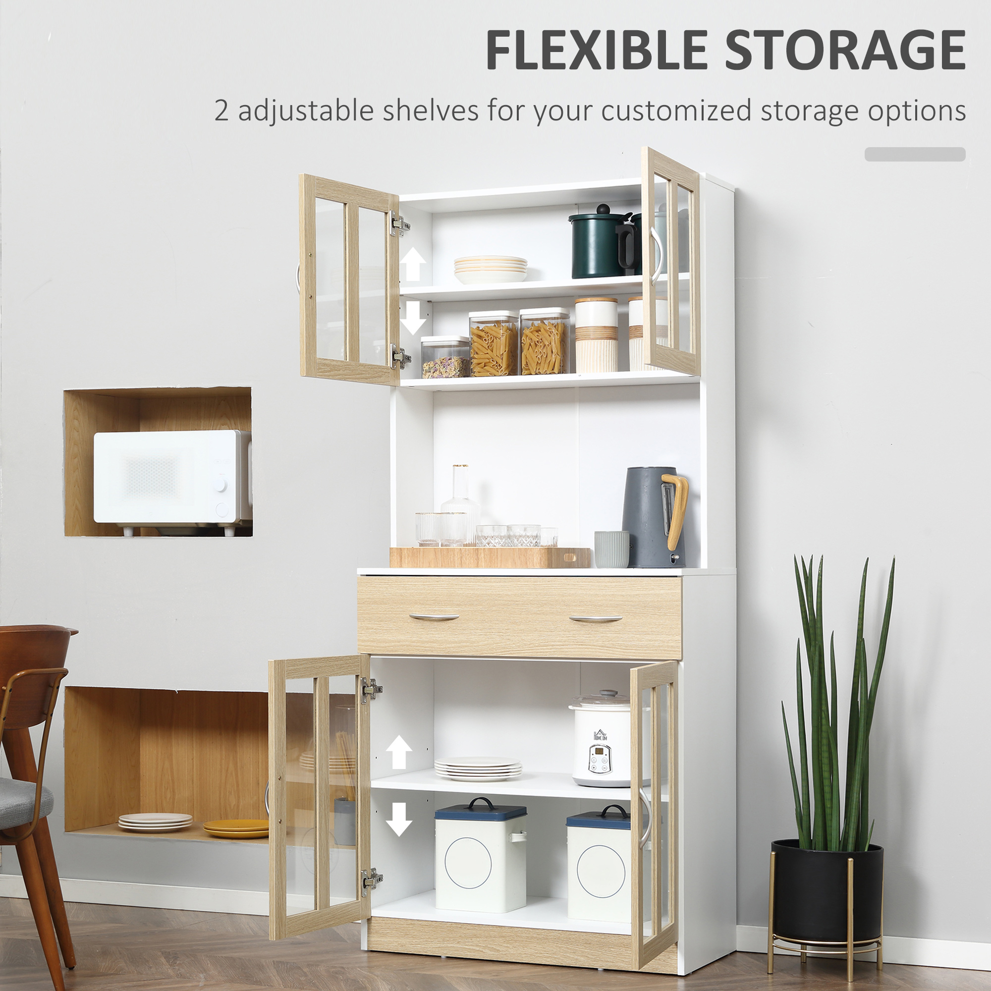 Kitchen space made easy with this freestanding hutch-style kitchen cabinet from HOMCOM. Crafted from particle board so it’s tough, with a veneered surface for a smooth and beautiful finish. Formed of an upper and lower cabinet, flat middle shelf and drawer, there’s plenty of room to hold small appliances, crockery, tins and packets. The white and wood-effect design of the kitchen dresser is classic, a piece perfect for loads of different home/office styles.