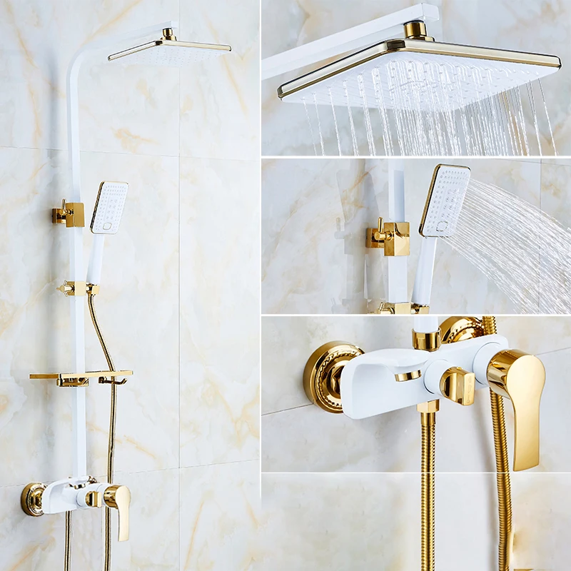 Hot Cold Bathroom Shower System Faucet Set 12 Inch Rainfall Shower Head Bras Bathroom Faucets White Gold Bathroom Shower Set