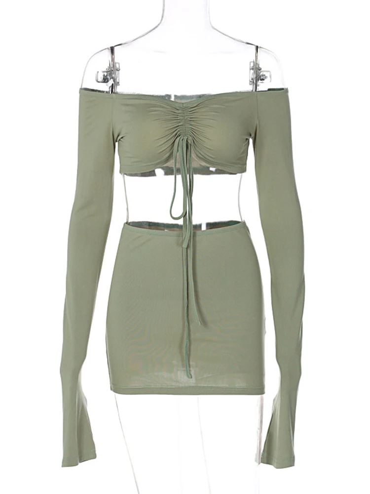 Hugcitar Women Matching 2 Piece Set Long Sleeve Drawstring Ruched Crop Top Mini Skirt Suit Co Ords Outfits Bodycon Sexy Party