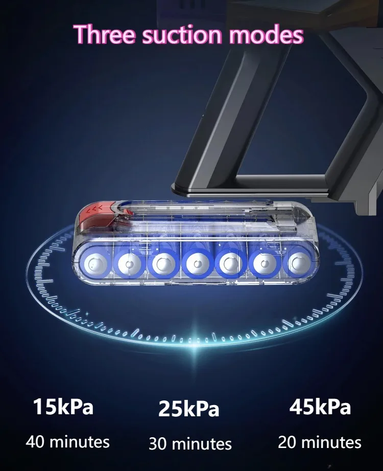 45kPa Strong Suction – Effortlessly picks up dust, debris, and pet hair from all surfaces.