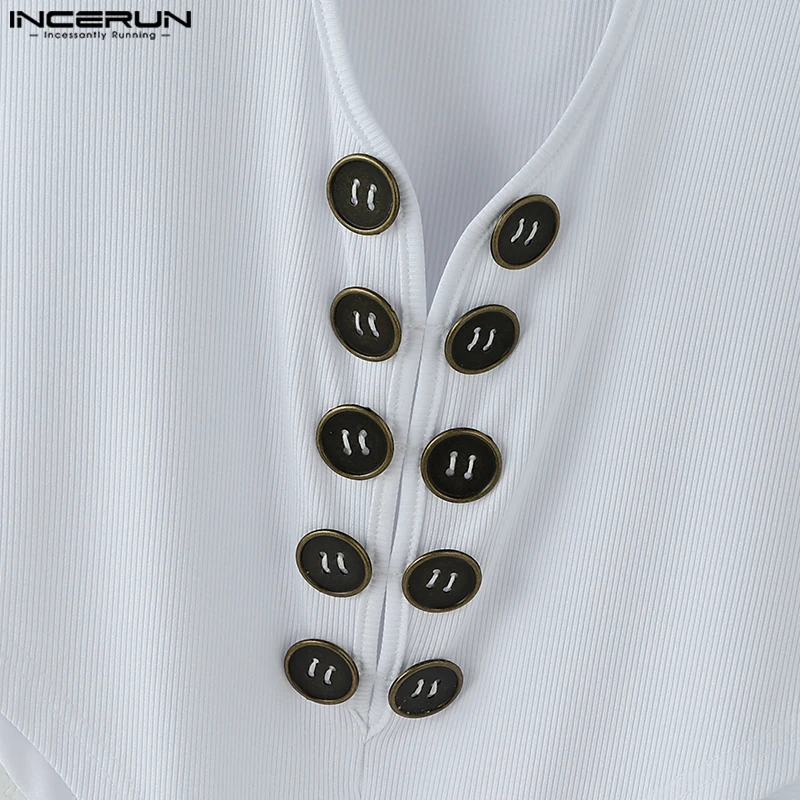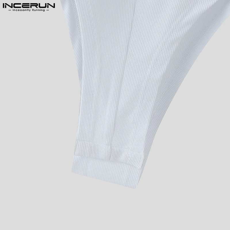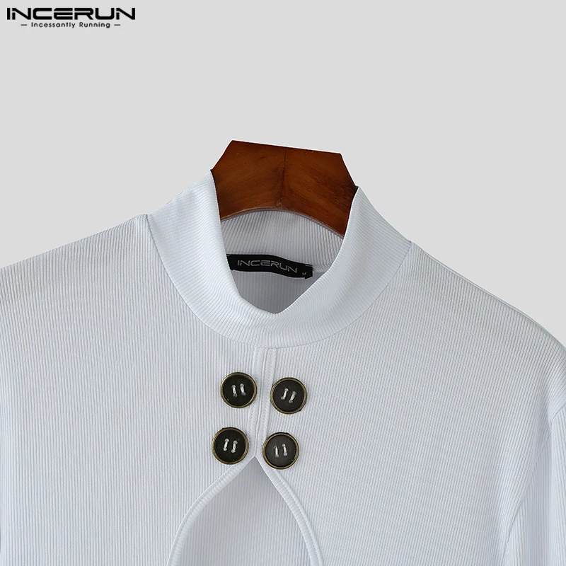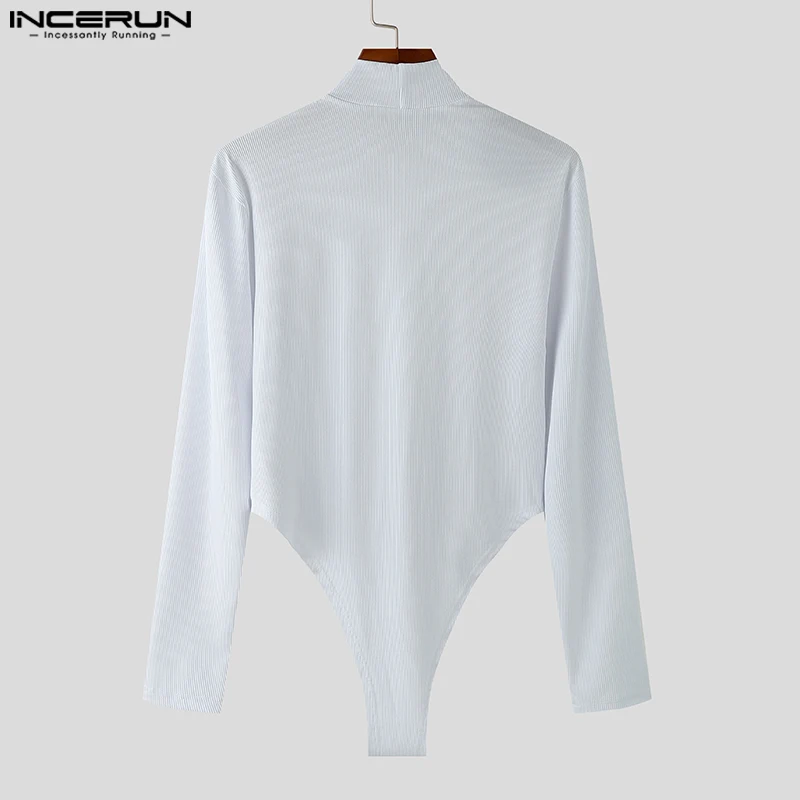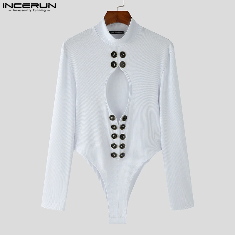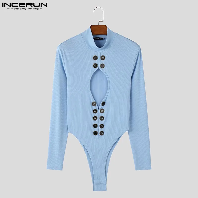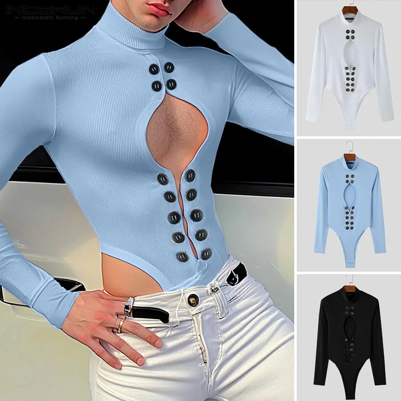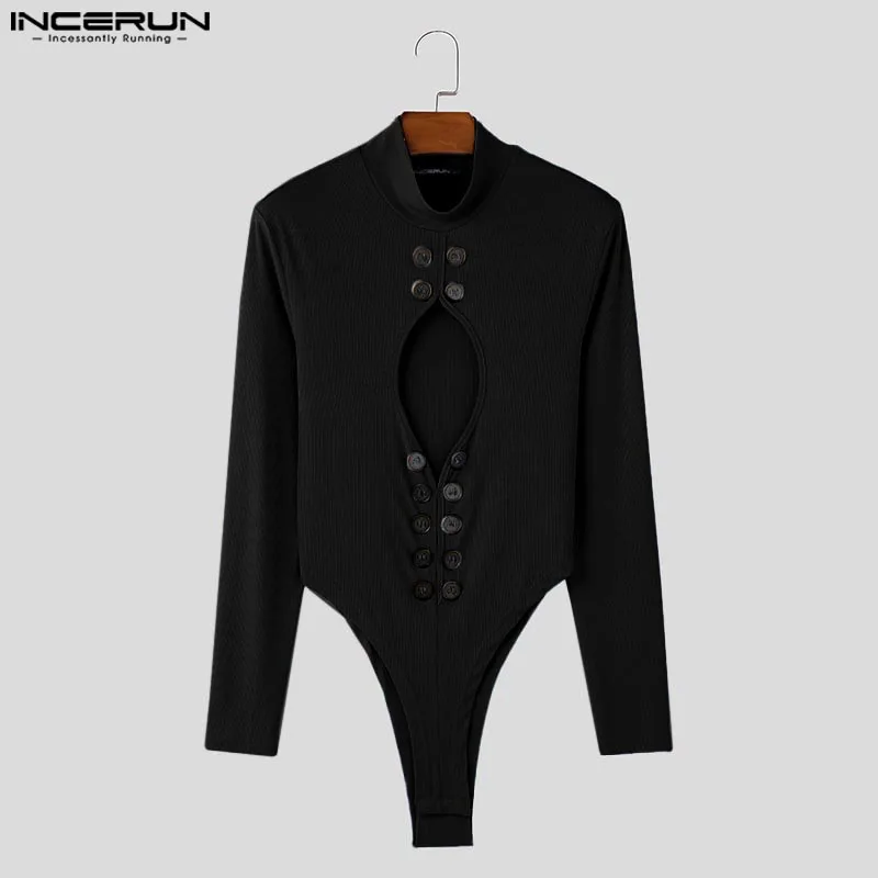 INCERUN Fashion New Men’s Jumpsuits Hollowed Button Design Rompers Casual Sexy Male Solid Long Sleeved High Neck Bodysuits S-5XL