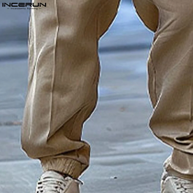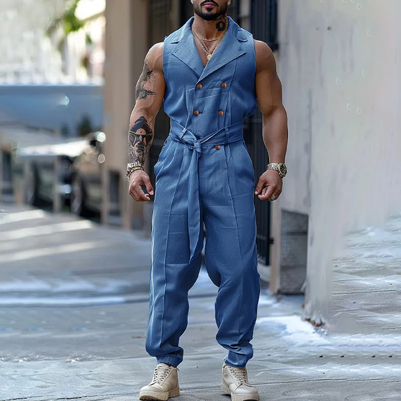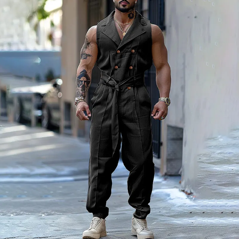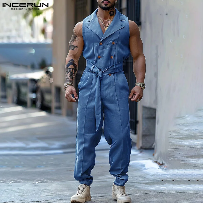 INCERUN Men Jumpsuits Solid Color Double Breasted Lapel Sleeveless Lace Up Male Rompers Streetwear Fashion Casual Overalls S-5XL