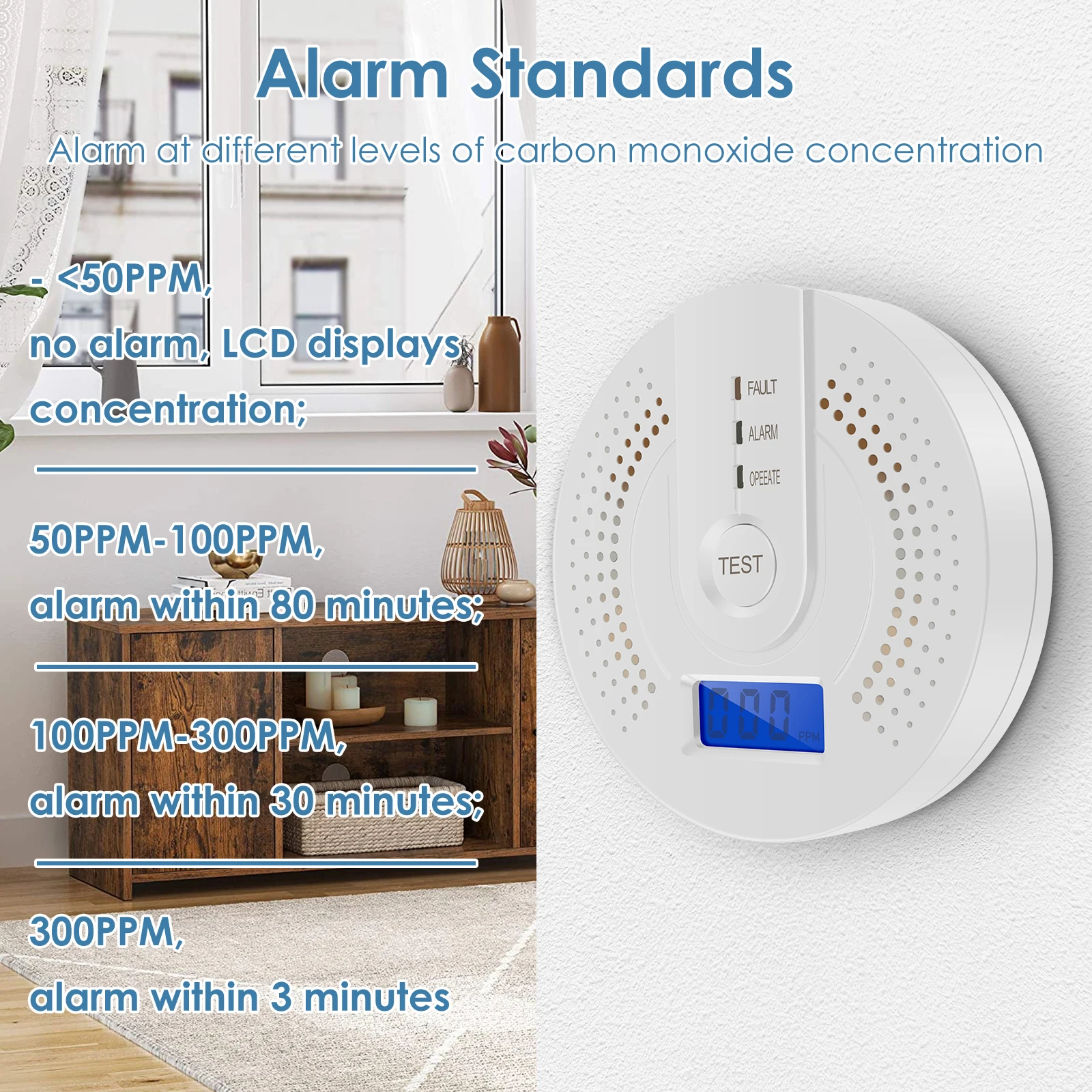 1.Alarm Standard: Alarm at different levels of carbon monoxide concentration, <50 PPM, no alert, LCD display concentration; 50 PPM-100 PPM, alert within 80 minutes; 100 PPM-300 PPM, alert within 30 minutes; 300 PPM, alert within 3 minutes