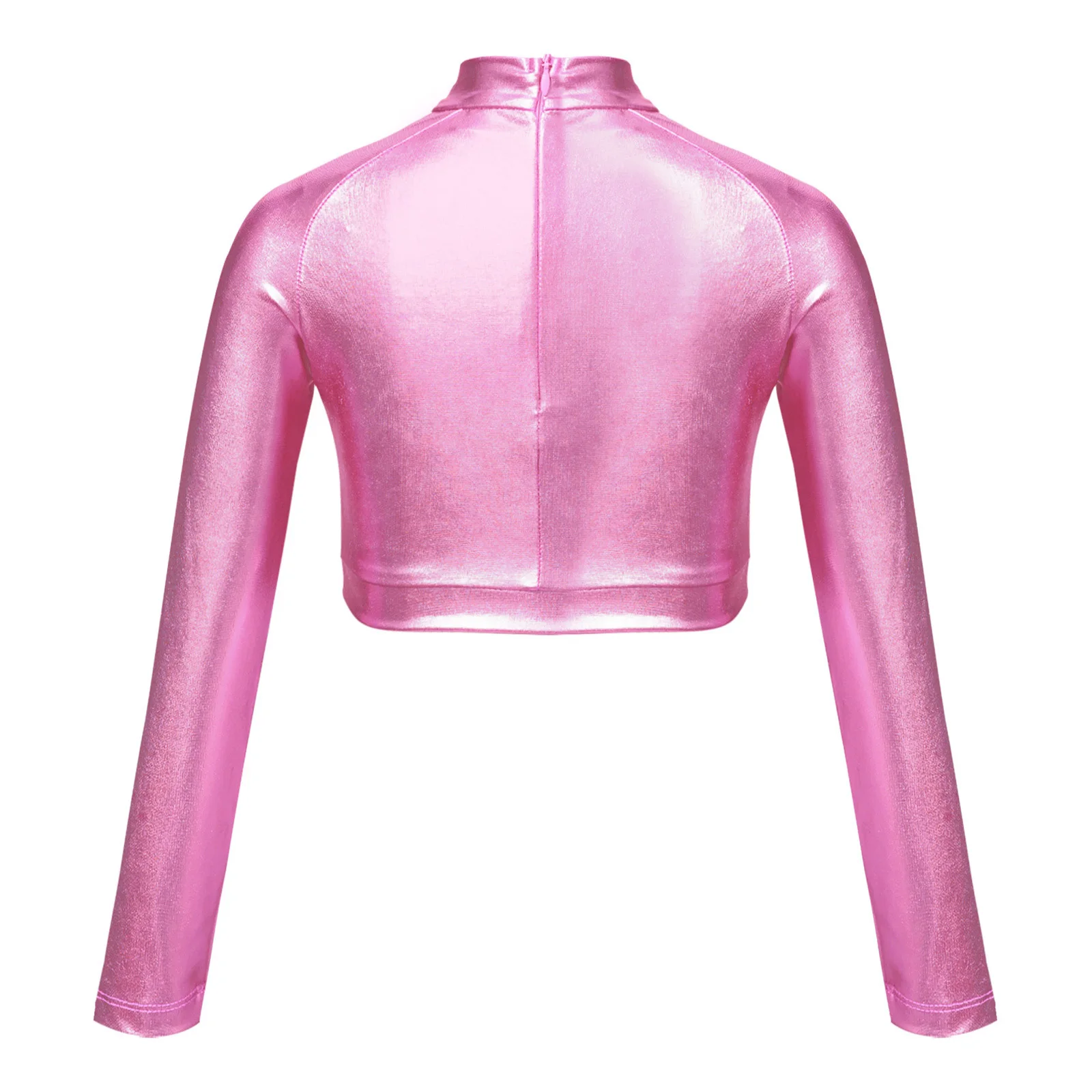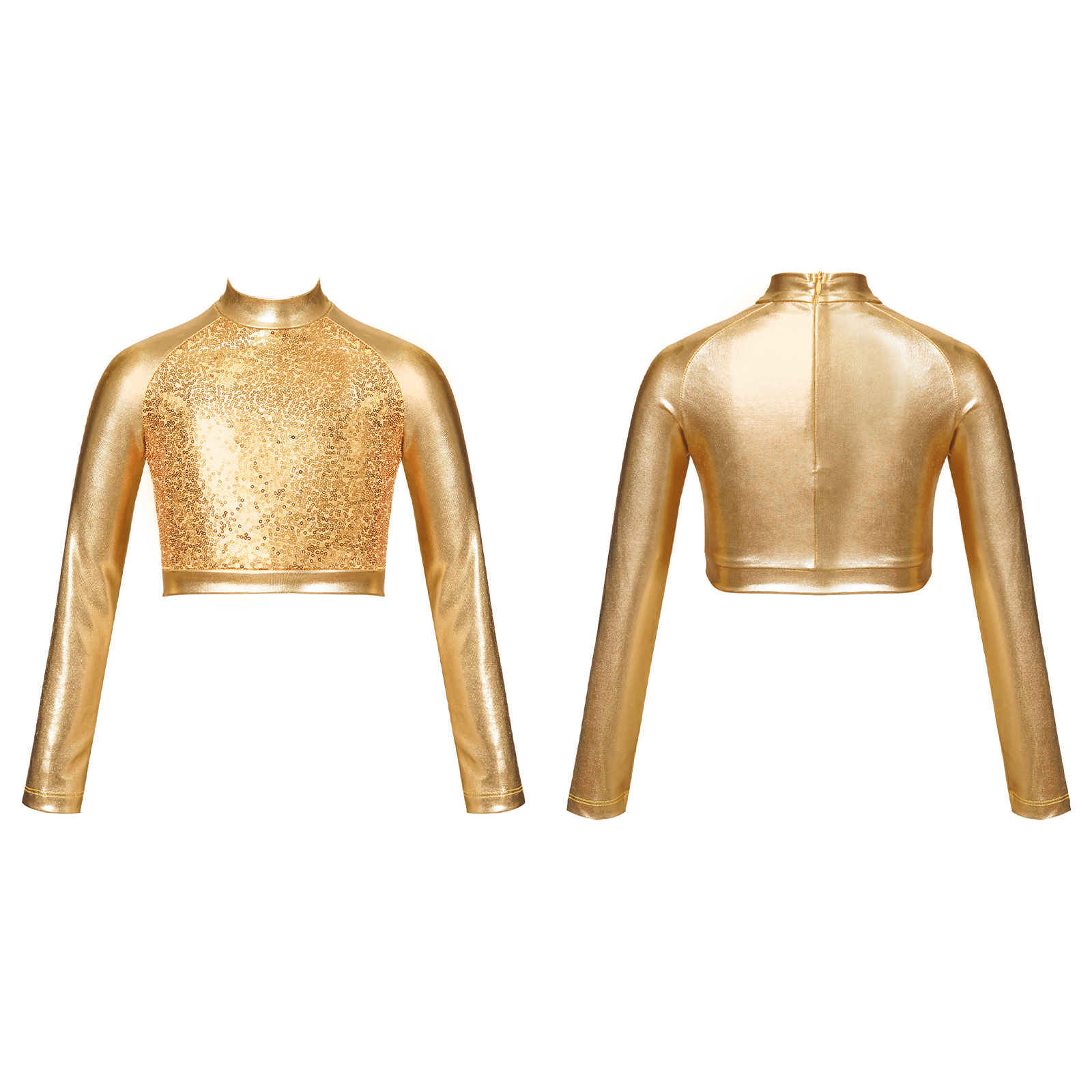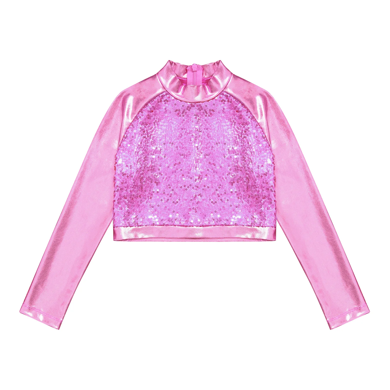 Jazz Hip-hop Dance Tops for Kids Girls Shiny Metallic Crop Top Mock Neck Long Sleeve Front Sequin Fully Lined Athletic T-Shirts