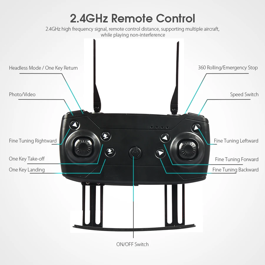 Functions: Up and Down, Forward/Backward, Left/Right Turn, Flanking Flight, 3-Flying Height, LED Lights, Headless Mode, One Key Auto Return, Altitude Hold Mode, WiFi FPV.