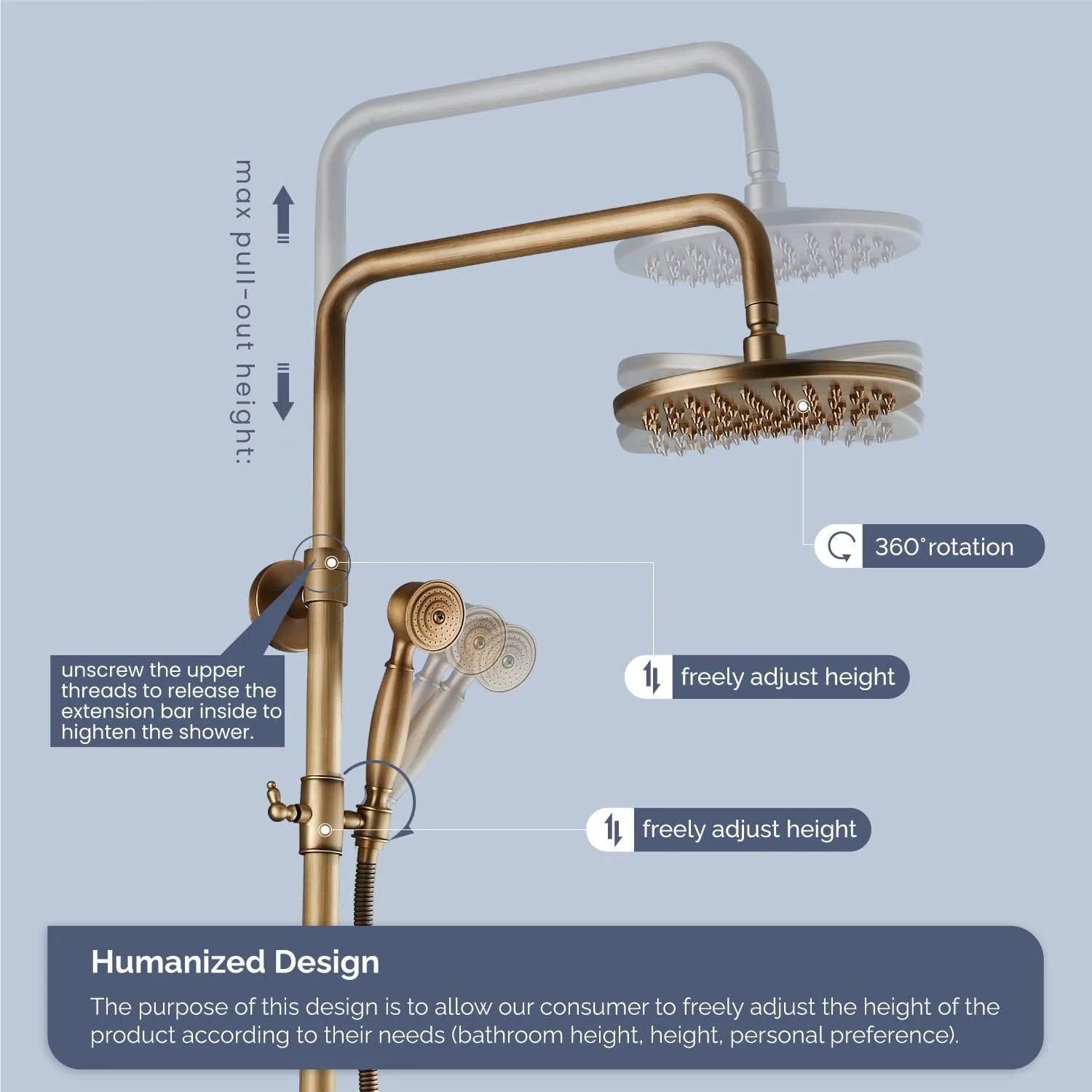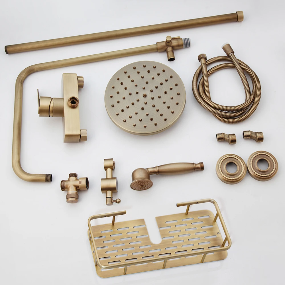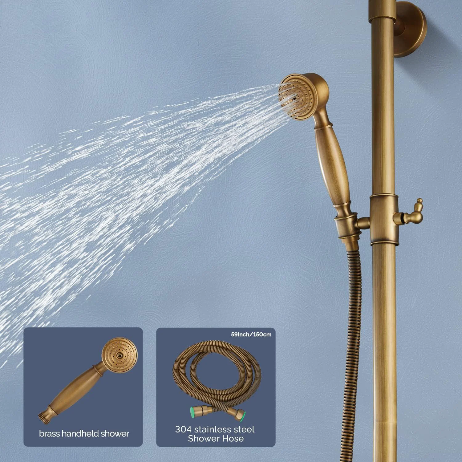 【Feature】:Double Knobs handle easy control hot and cold water.Has dual functions, overhead rainfall shower and handheld spray. Diverter switches between top shower and hand spray. Choose freely meet different needs.Both rain shower head and handheld shower can offer you a good experience of shower. Shower storage rack provided.