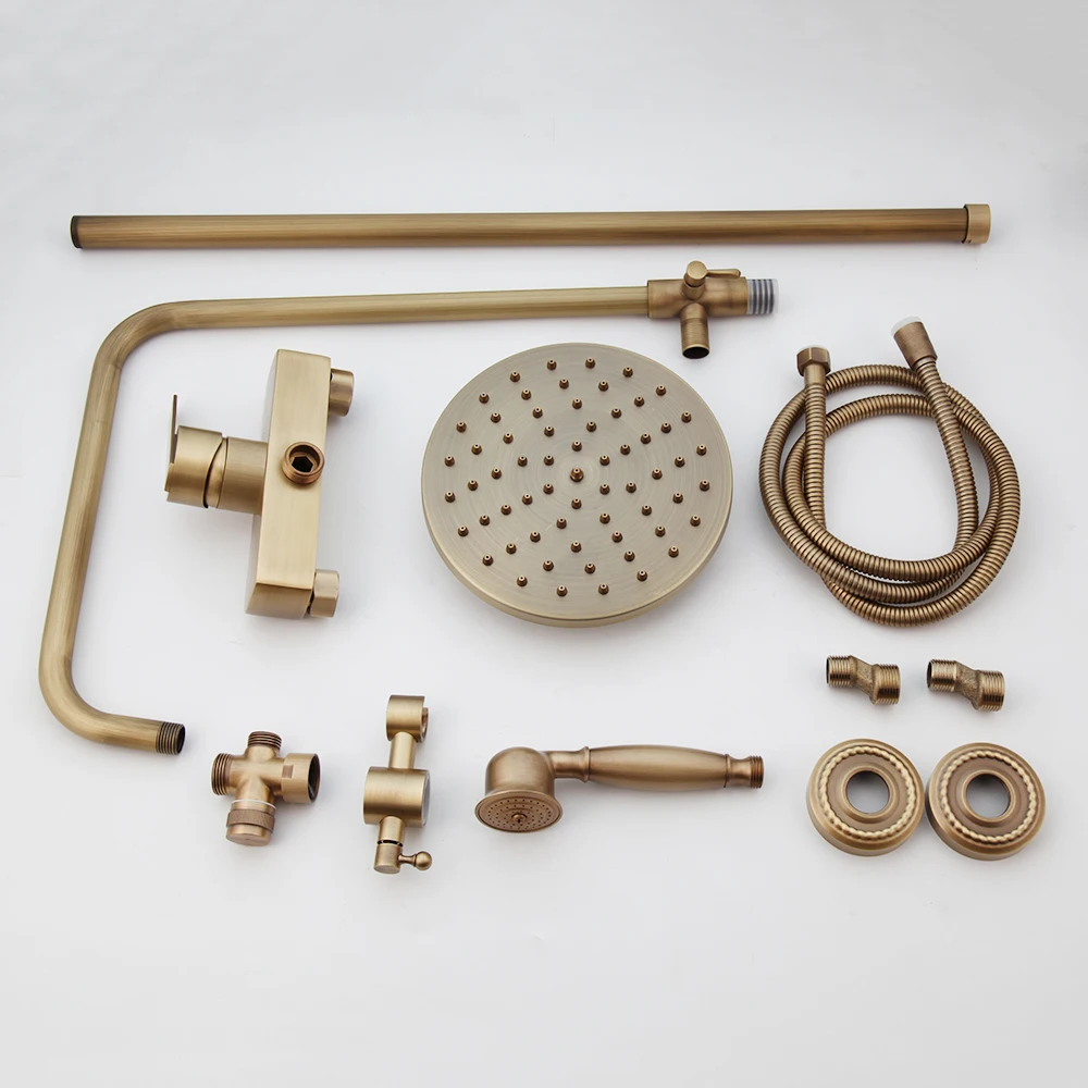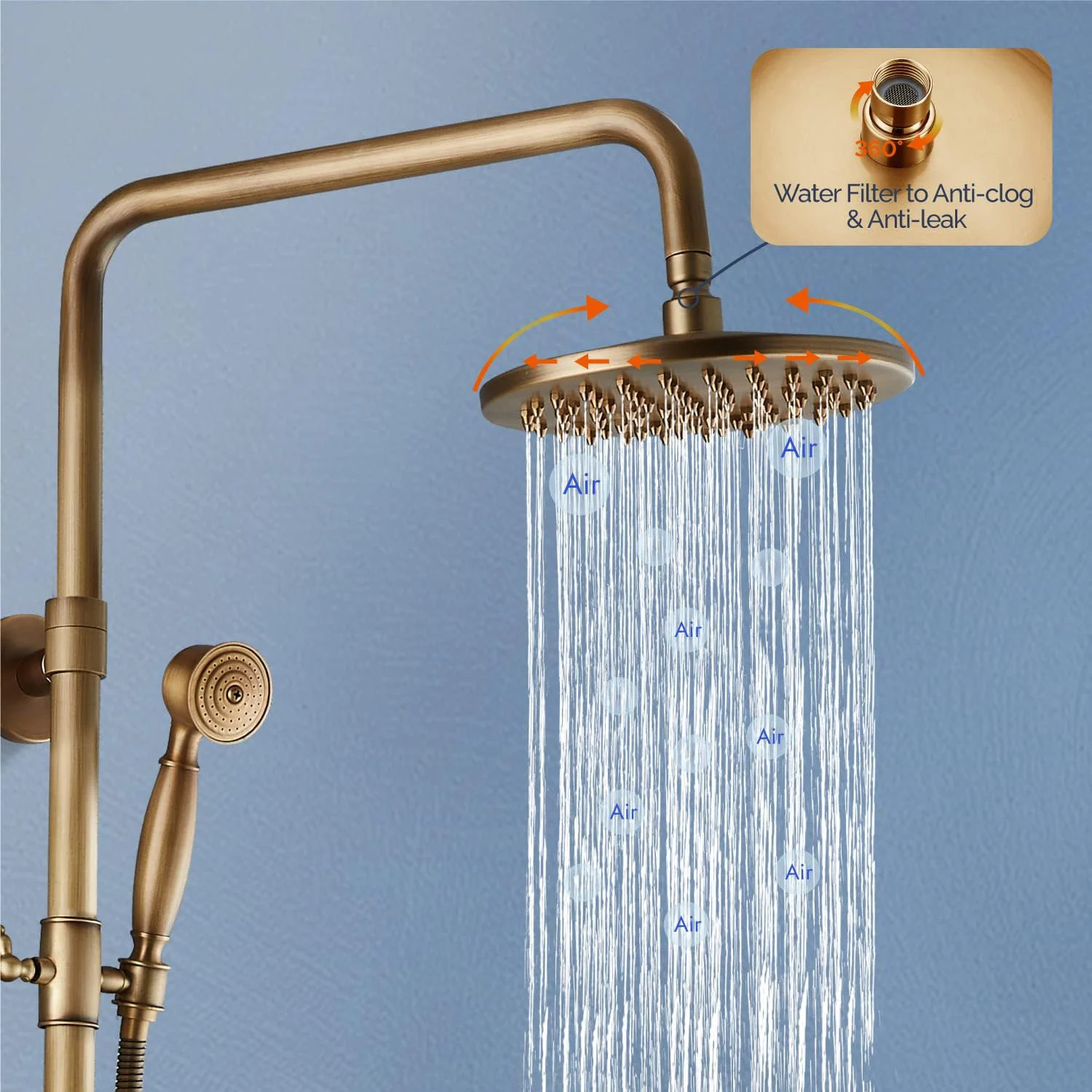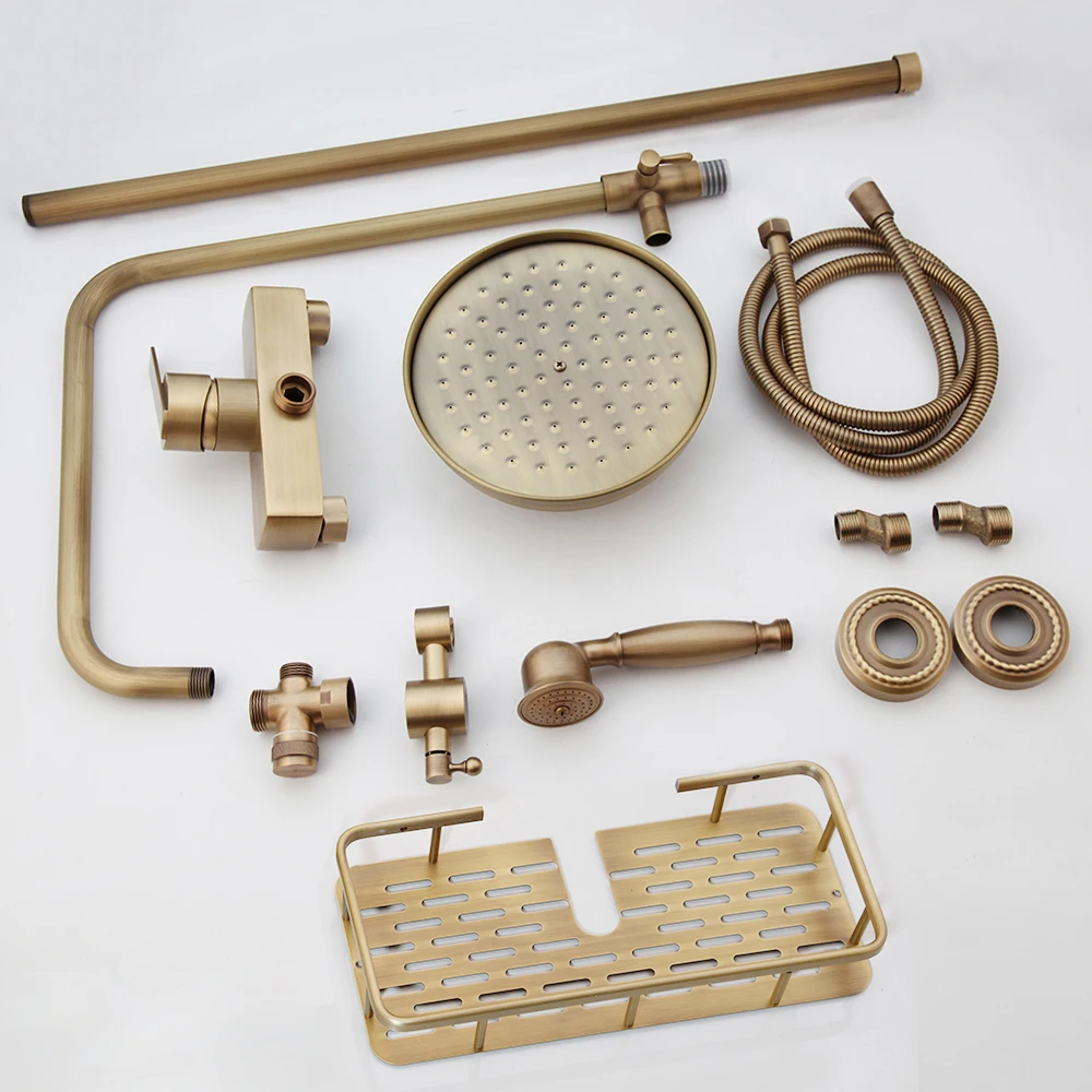 【Feature】:Double Knobs handle easy control hot and cold water.Has dual functions, overhead rainfall shower and handheld spray. Diverter switches between top shower and hand spray. Choose freely meet different needs.Both rain shower head and handheld shower can offer you a good experience of shower. Shower storage rack provided.