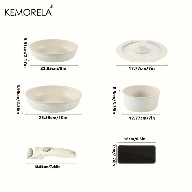 KEMORELA 5pcs White Nonstick Cookware Set with Detachable Handles – Stackable Oven Safe Pots & Pans for Camping and Home Kitchen