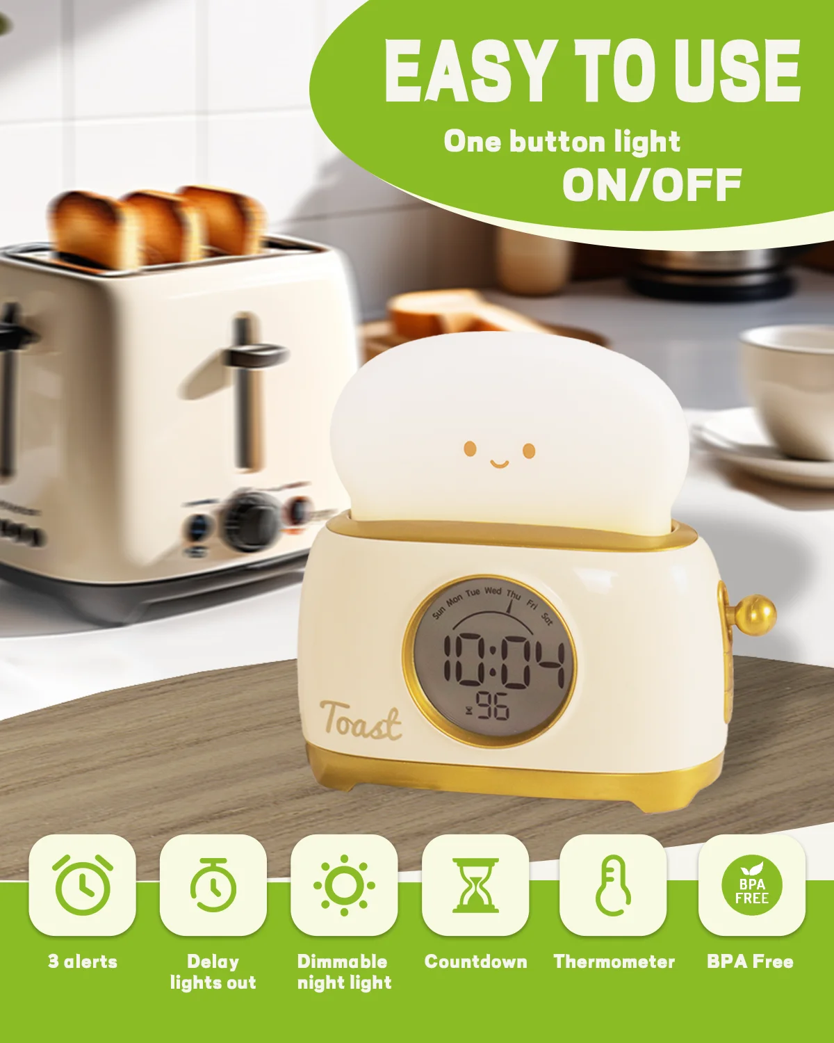 [Creative Digital Clock with Night Light] This digital clock is designed with a toaster shaped night light which is cute and easy to use. Press to switch on the light and it is dimmable that long press to adjust the brightness, and double click to delay bedtime. Which is practical can be used as a light at night.