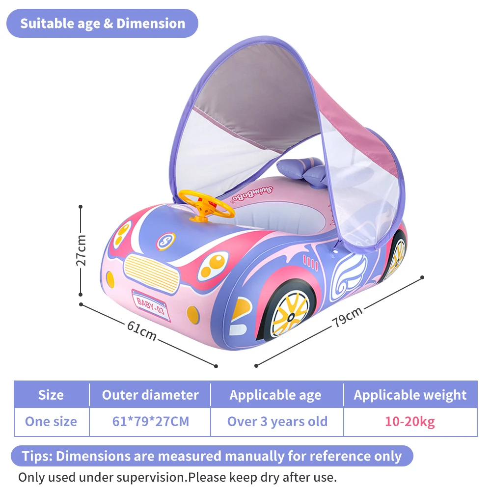 【Attractive shape】 Cool Car boat pool float will introduce your baby to the joys of water, Suitable for children2-7 yearsold,Removable&adjustable canopy features a multi-position plastic hinge, which allows for 120-degree range and UPF 50 sun protection. 【Safety design 】Smooth leg holes, durable and with great buoyancy support,will not tip over.