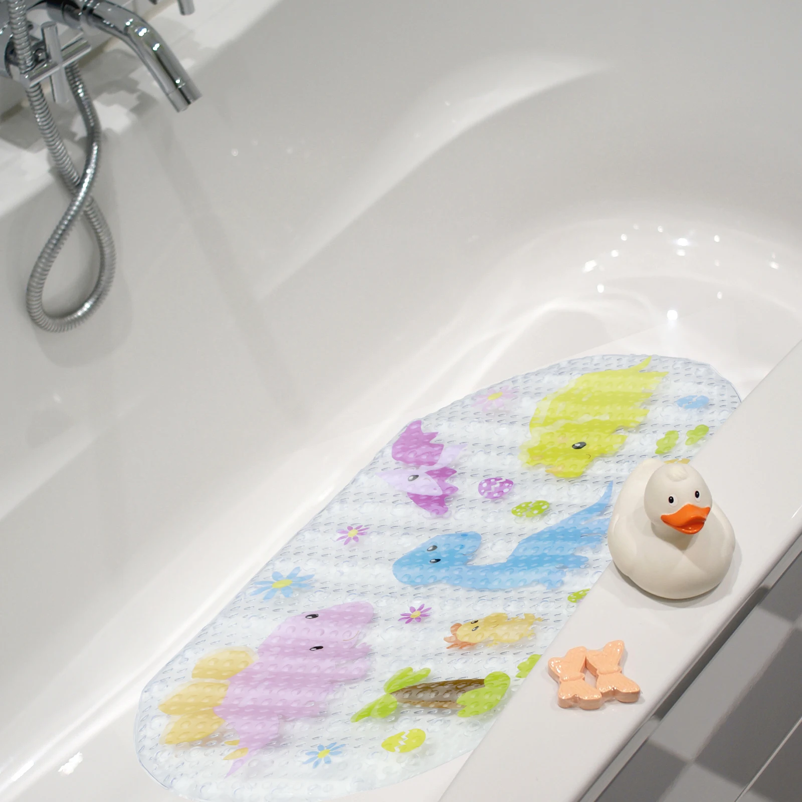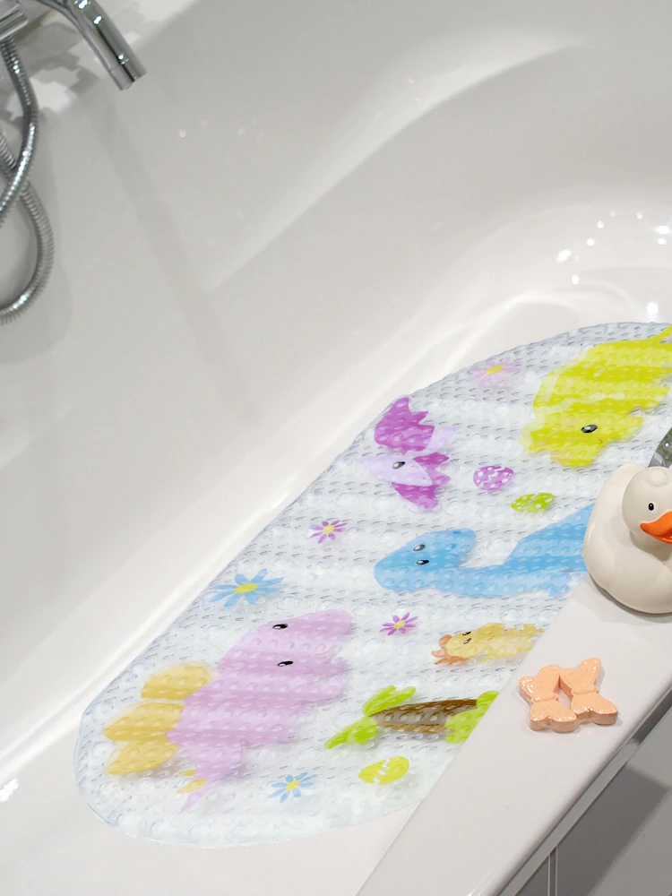 A cute baby bath mat with cute cartoon pattern, which is nice and attractive. With powerful suction cup and rounded bump massage design it is non-slip and comfortable to step on, providing a protection for baby form accidental slip while taking a bath.